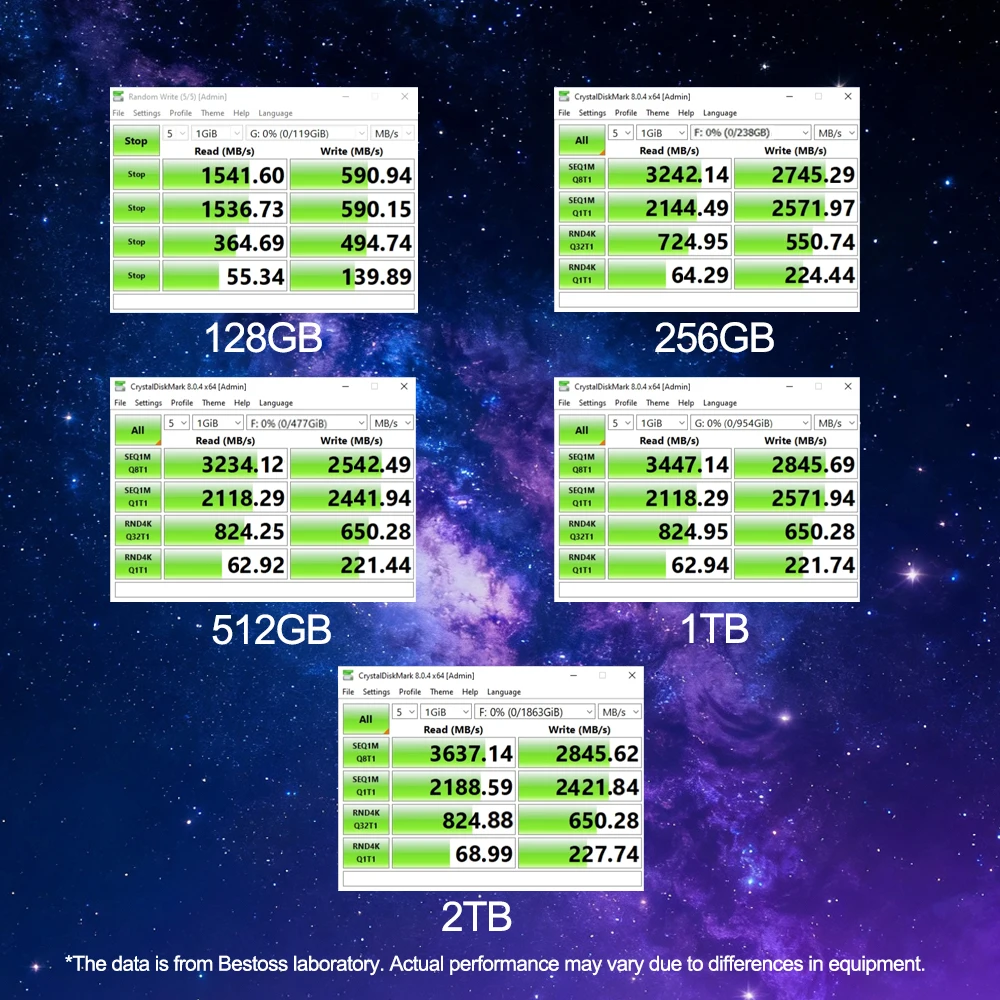 Due to capacity limitations, the maximum read speed of M.2 NVMe 128GB products is 1000MB/s-1500M/s, and the maximum read speed of 256GB 512GB 1TB products is 3000-3500MB/s. Please confirm before placing an order, thank you!