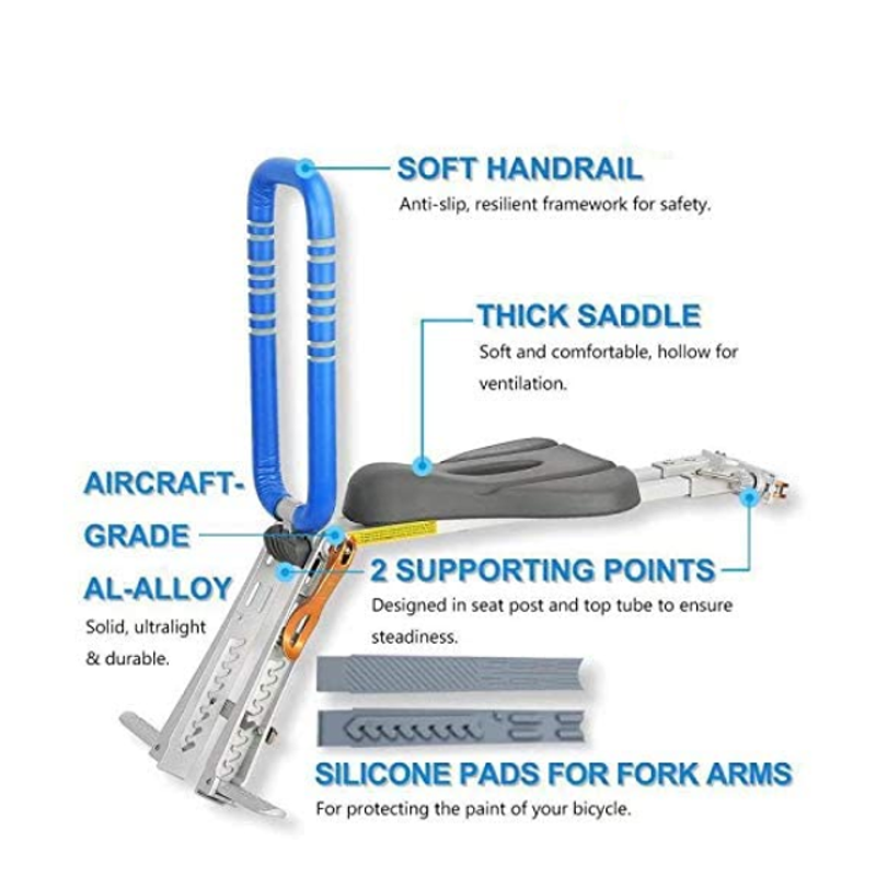 SAFE & COMFORTABLE -- USA Safety Standard Certificate. Comfort, safety, an attractive and innovative design, and a good position where the child can fully explore the scenery. Soft and comfortable saddle, hollow for ventilation. Adjustable handrail and fork arm.