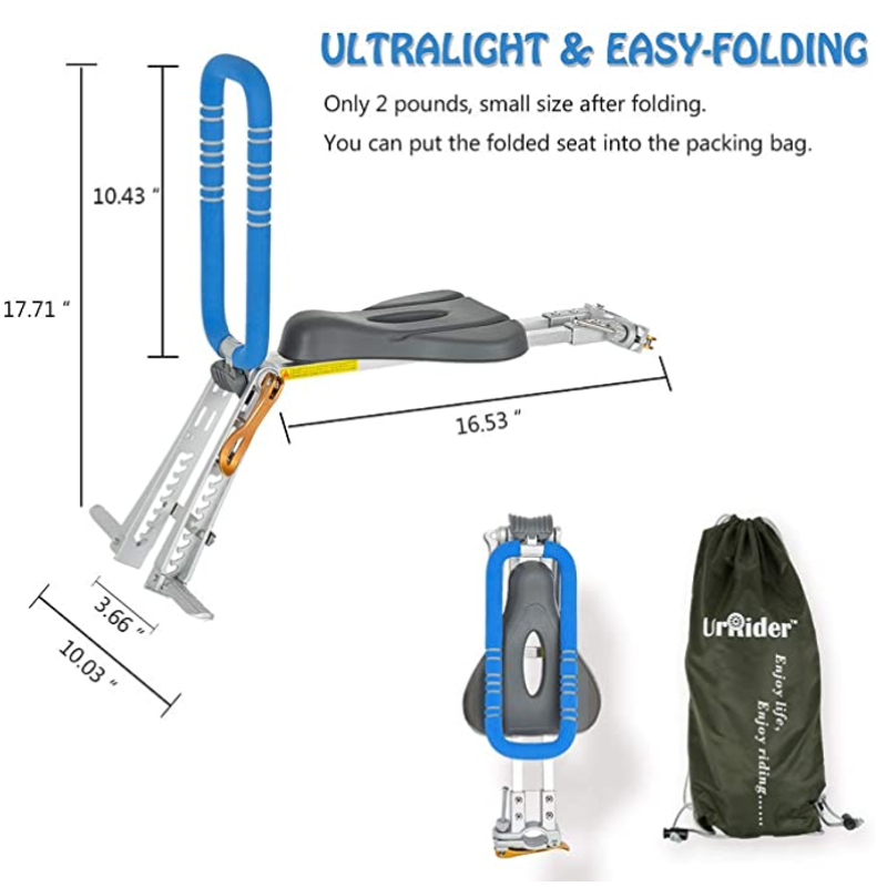 FOLDABLE -- The child seat for bike is easy-folding, ultralight (about 2 pounds), with a free packing bag. Designed and tested for kids from 2 to 6 years old, up to 4.1 feet(125cm) height.
