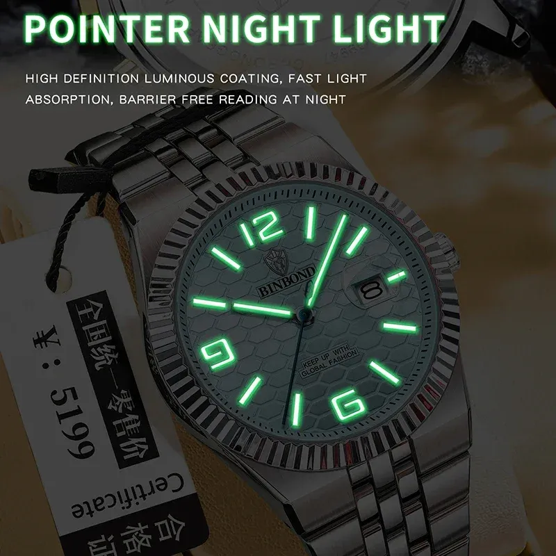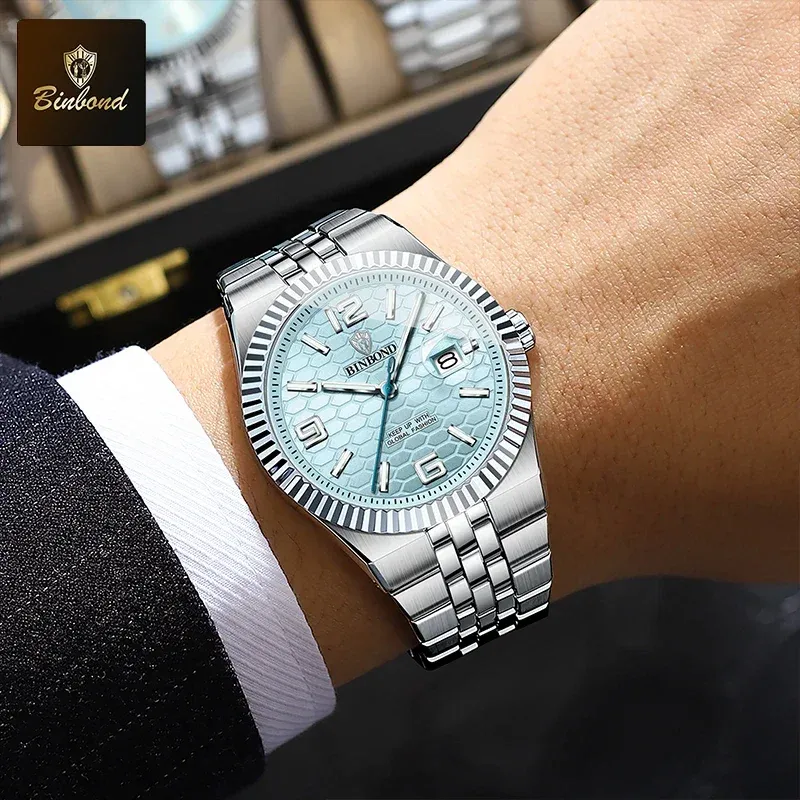 BINBOND Top Business Men's Watches Stainless Steel Textured Luminous Dial Leisure Quartz Watch Waterproof Outdoor Sports Watch