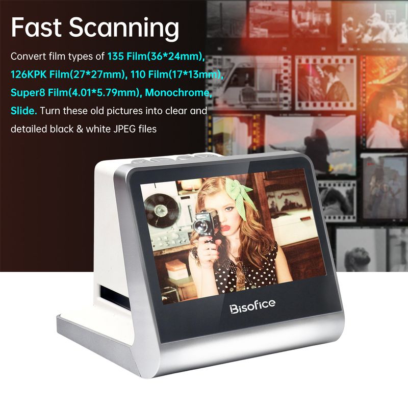 Film & Photo Scanner: Convert film types of 135 Film(36*24mm), 126KPK Film(27*27mm), 110 Film(17*13mm), Super8 Film(4.01*5.79mm), Monochrome, Slide. Turn these old pictures into clear and detailed black & white JPEG files