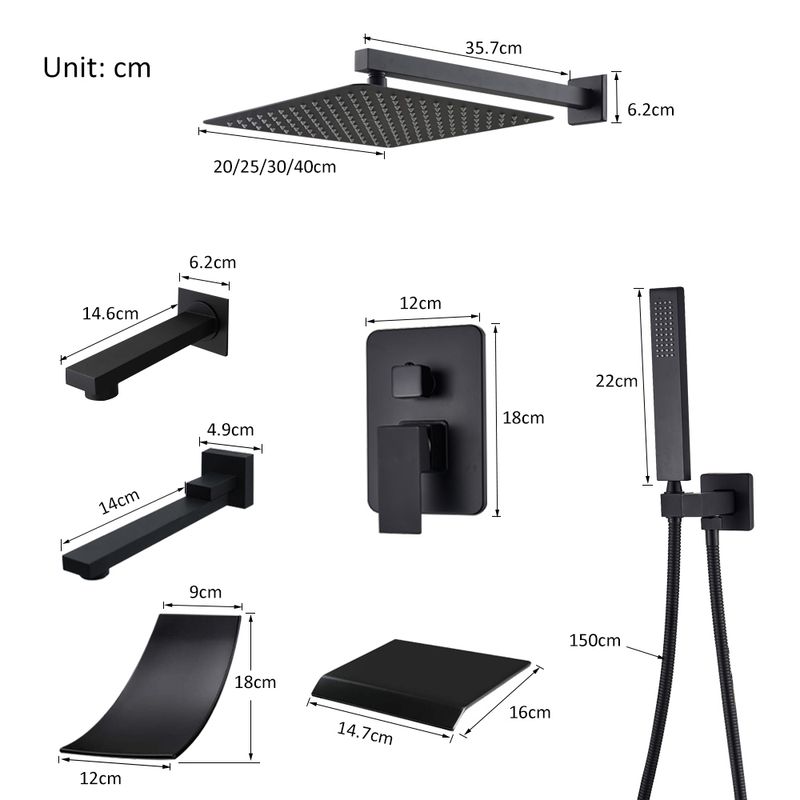 Black Concealed Shower System Rain Waterfall Bathroom Embedded Shower Faucet Set with Tub Spout