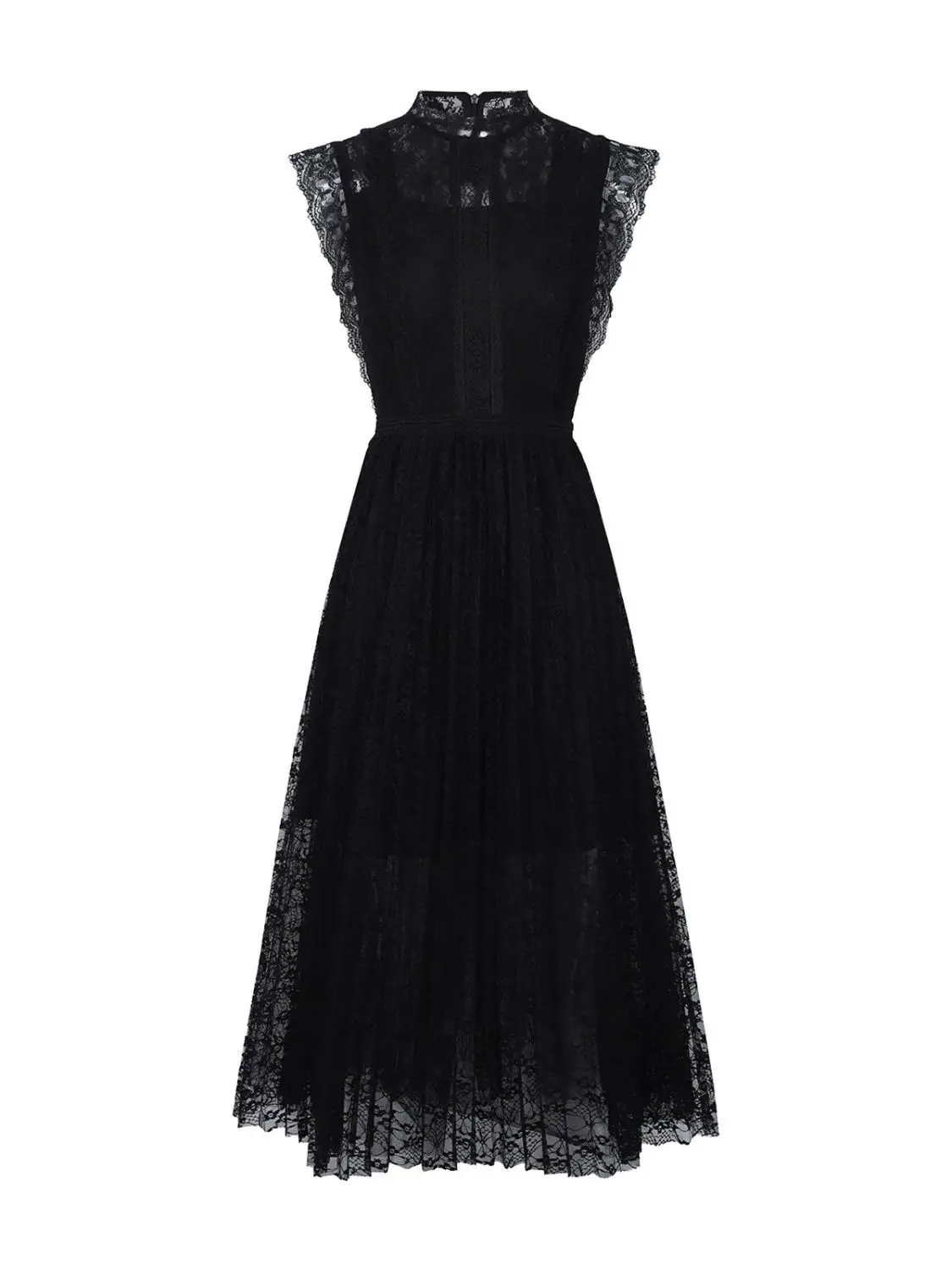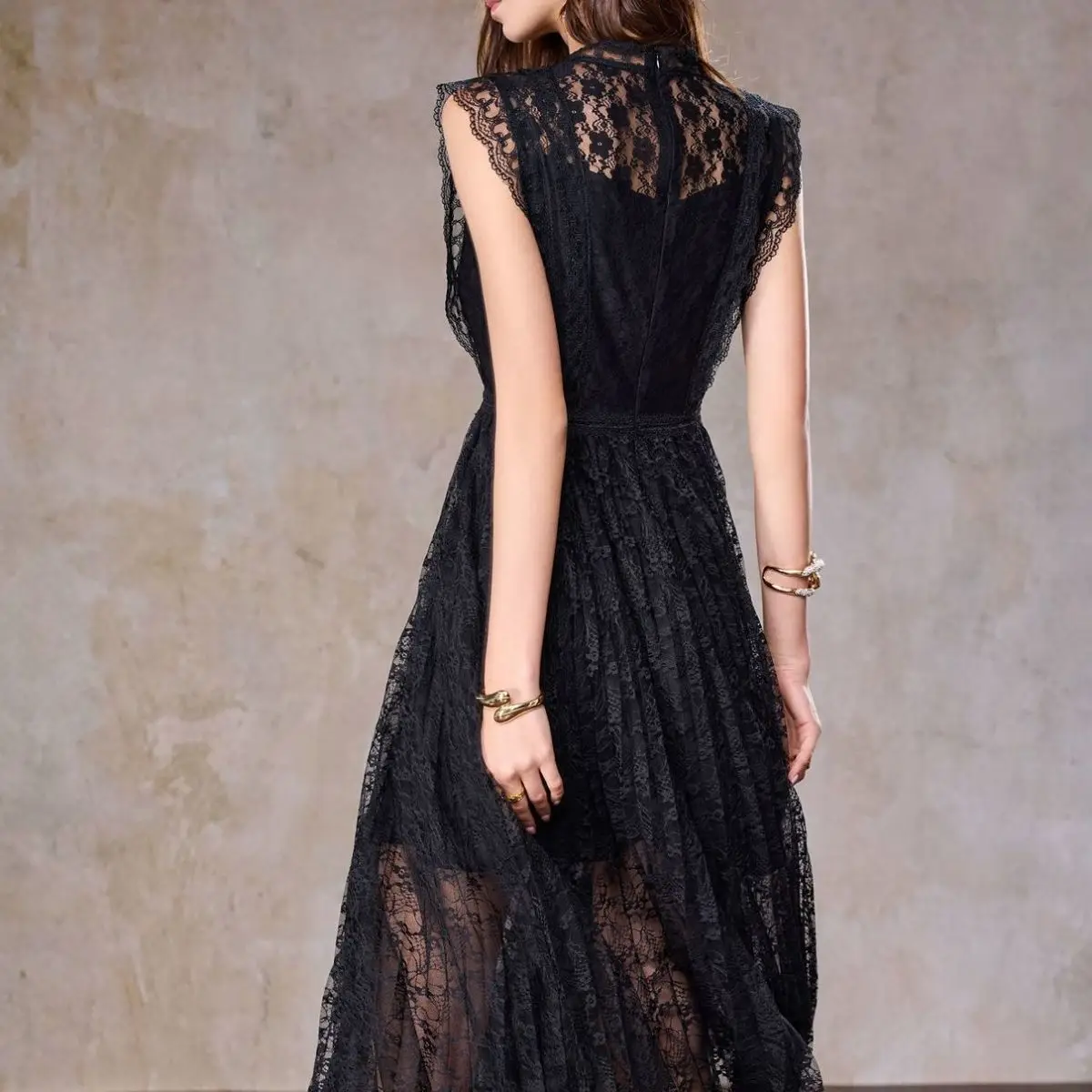 Black Ladylike Stand-up Collar Lace Dress for Women 2025 New Sleeveless High-end Design Large Hem Skirt