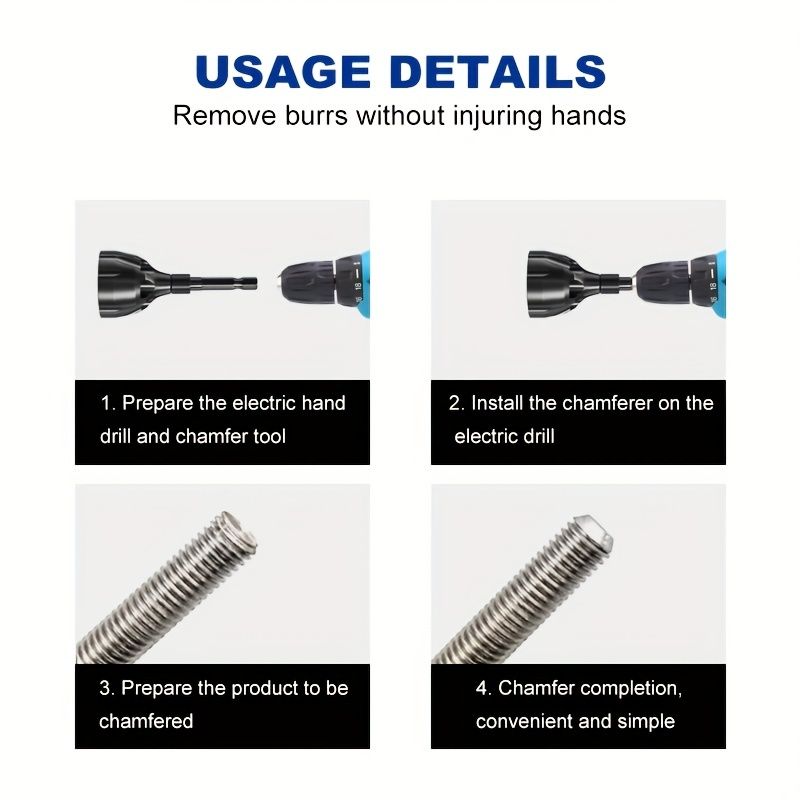 Easy to use: Place the deburring outer chamfer tool on the end of your electric drill, starting at the lowest speed, then lightly apply pressure to remove the burr and increase the speed as needed (recommended drilling speeds are 0-400 RPMs).