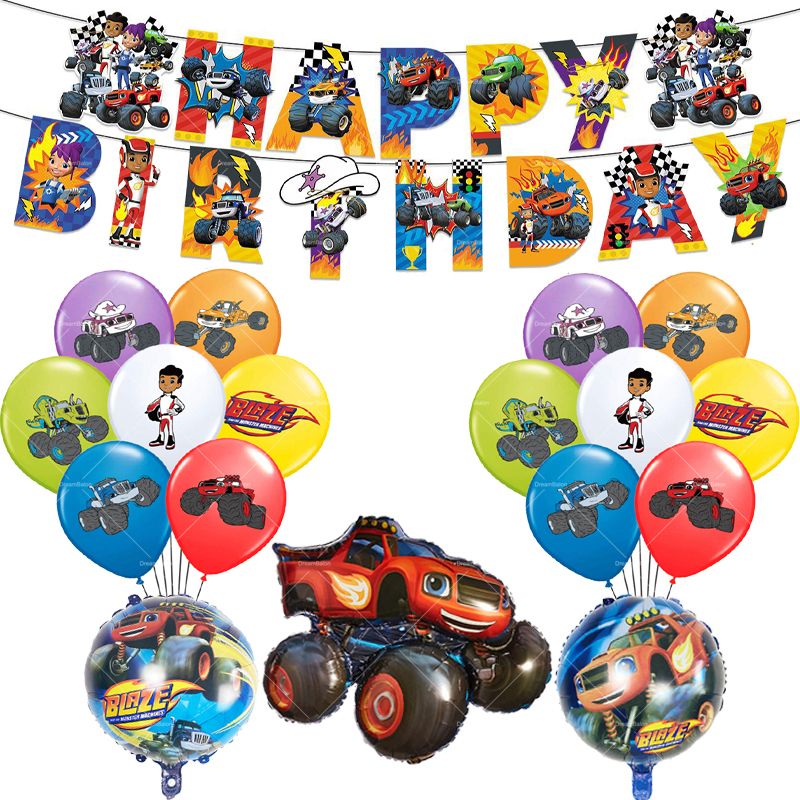 Blaze Monster Balloons Machines Race Car Happy Birthday Banner Party Decoration Cake Topper Disposable Tableware Background Ball
