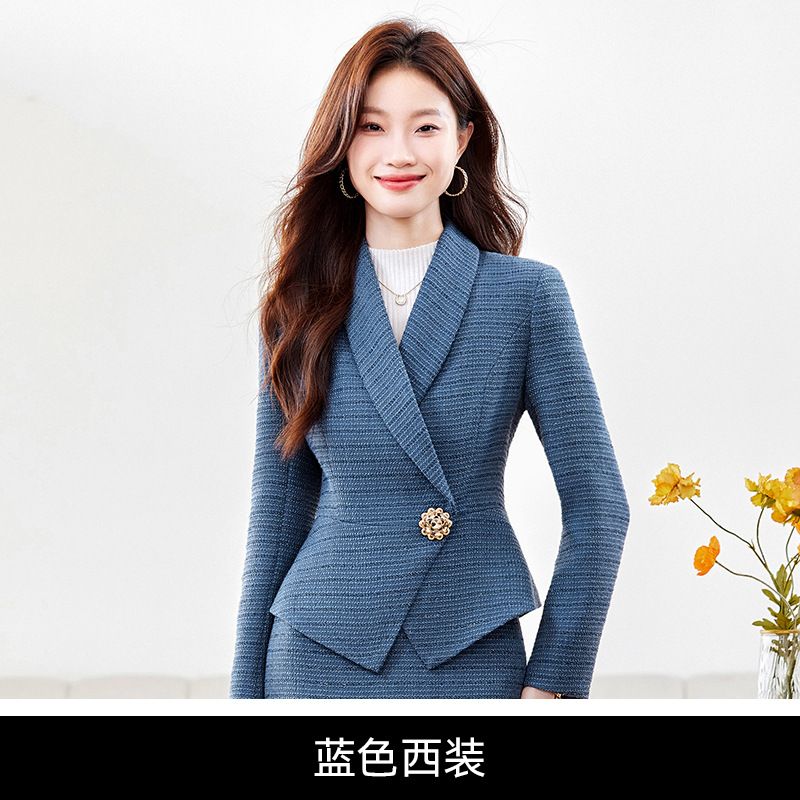 Blue Long Sleeve Women's Dress Set Ladies Autumn Winter Fashionable Elegant Formal Suit Short Casual Blazer Dress Set