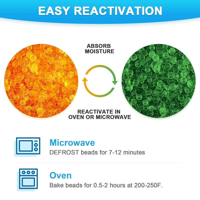 ompact and lightweight: The reusable silica gel beads are small and lightweight, easy to carry and store. it is very suitable for travel or outdoor activities.