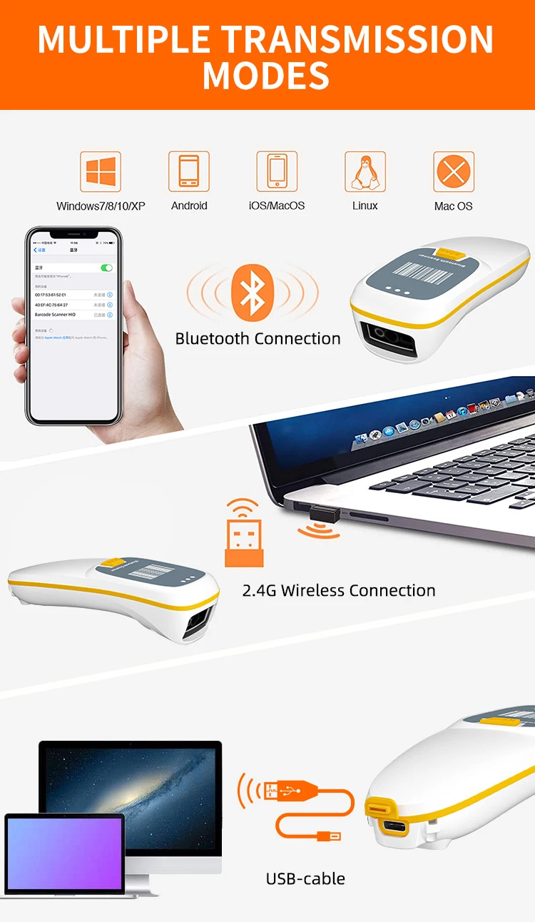 1. NETUM C740 3 in 1 connections: Scanner can work via 2.4G USB Dongle (by default) or USB cable or bluetooth.
