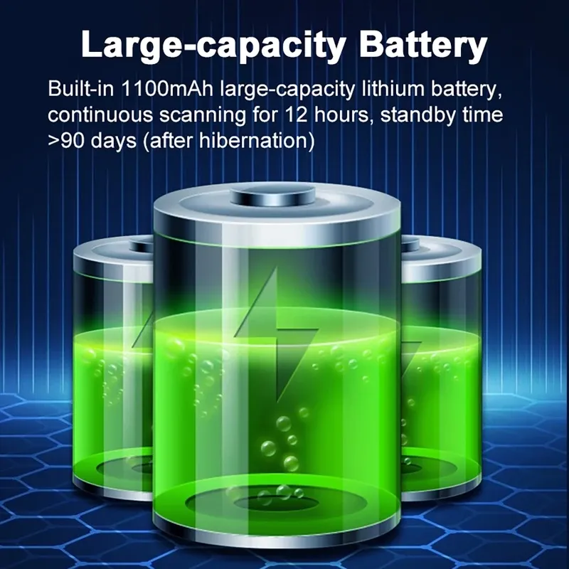 * Large capacity battery: built-in 1100mAh large capacity lithium battery, can scan continuously for 12 hours, standby time ≥ 90 days (after sleep).