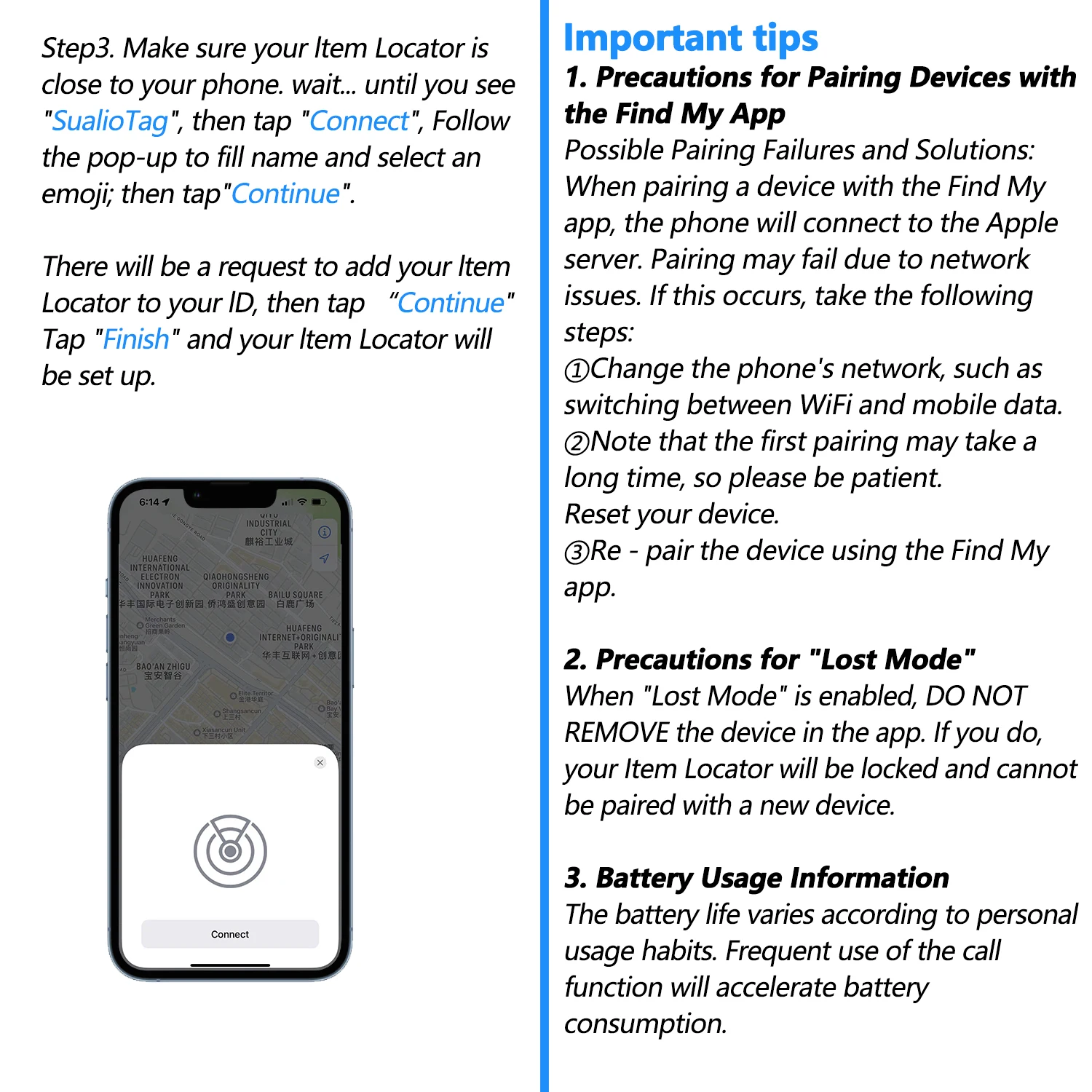• Possible Pairing Failures and Solutions: When pairing a device with the Find My app, the phone will connect to the Apple server. Pairing may fail due to network issues. If this occurs, take the following steps: