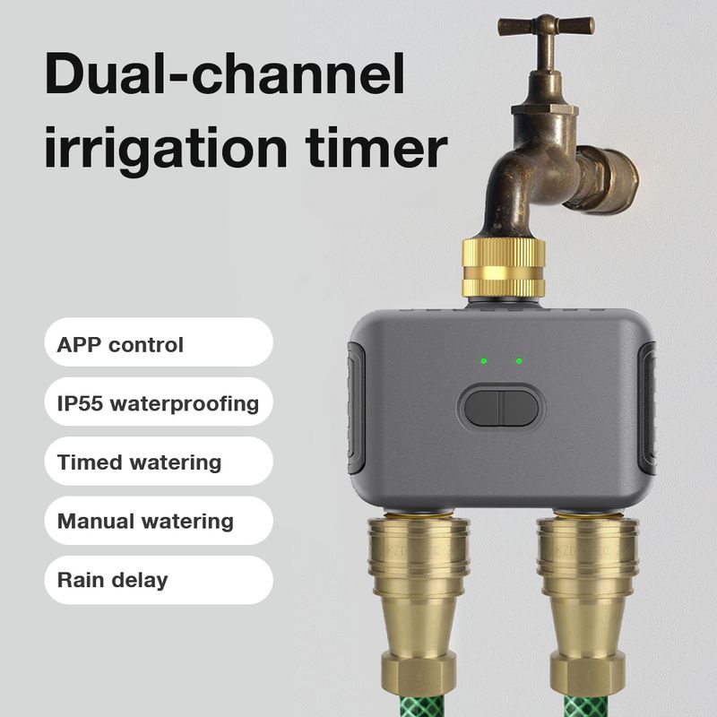 Bluetooth/Zigbee-compatible two-way independent control, suitable for lawn watering, potted drip irrigation, swimming pool water storage, atomization cooling, temporary watering and other scenarios. It supports ordinary single timed watering, and can also set cycle timed watering plan, manual weather delay, and can query watering records.
