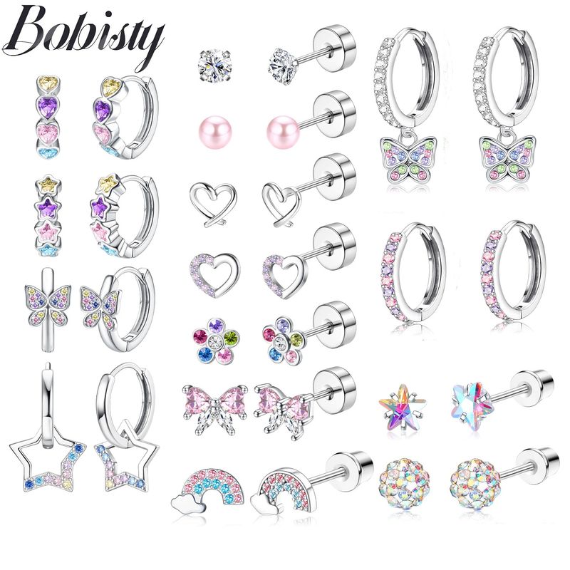 Bobisty 1 Pair Hypoallergenic Screw Back Stud Earrings For Women Surgical Steel Hoop CZ Butterfly Star Dangle Earrings Set 20G