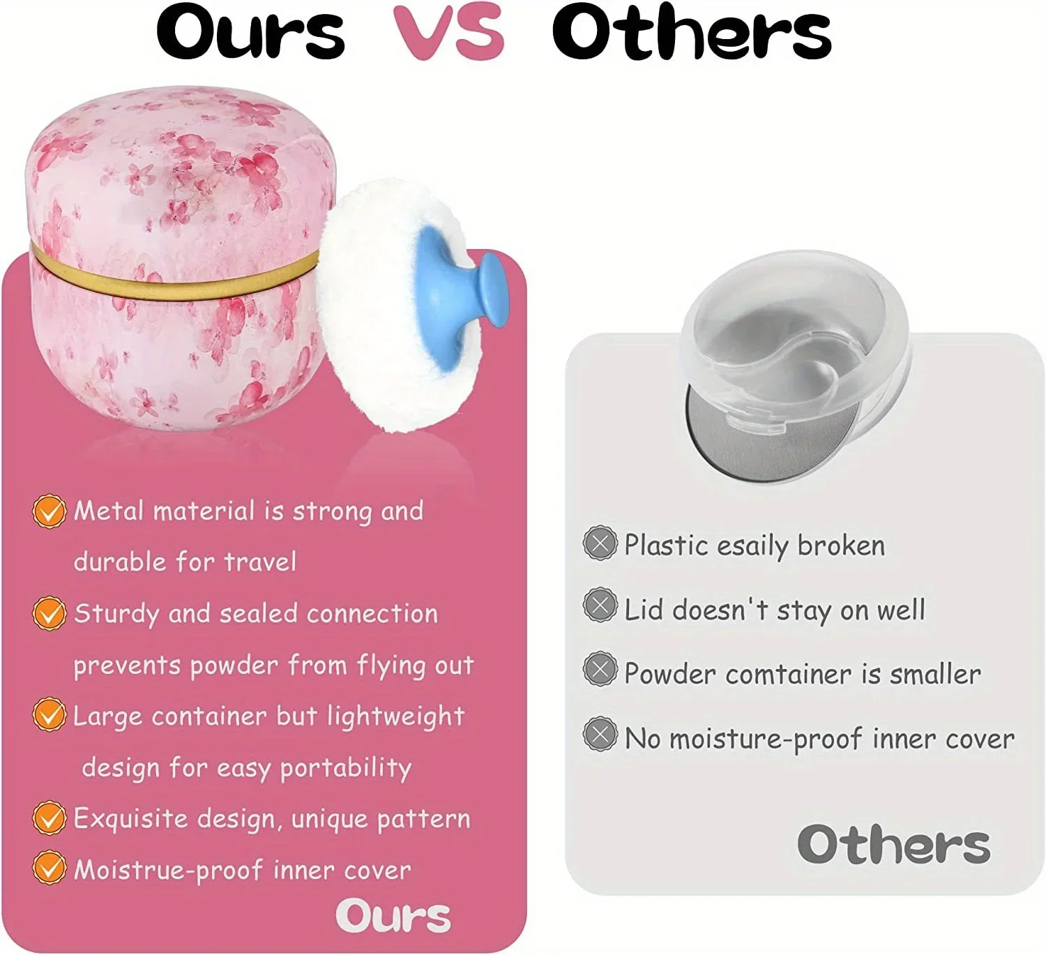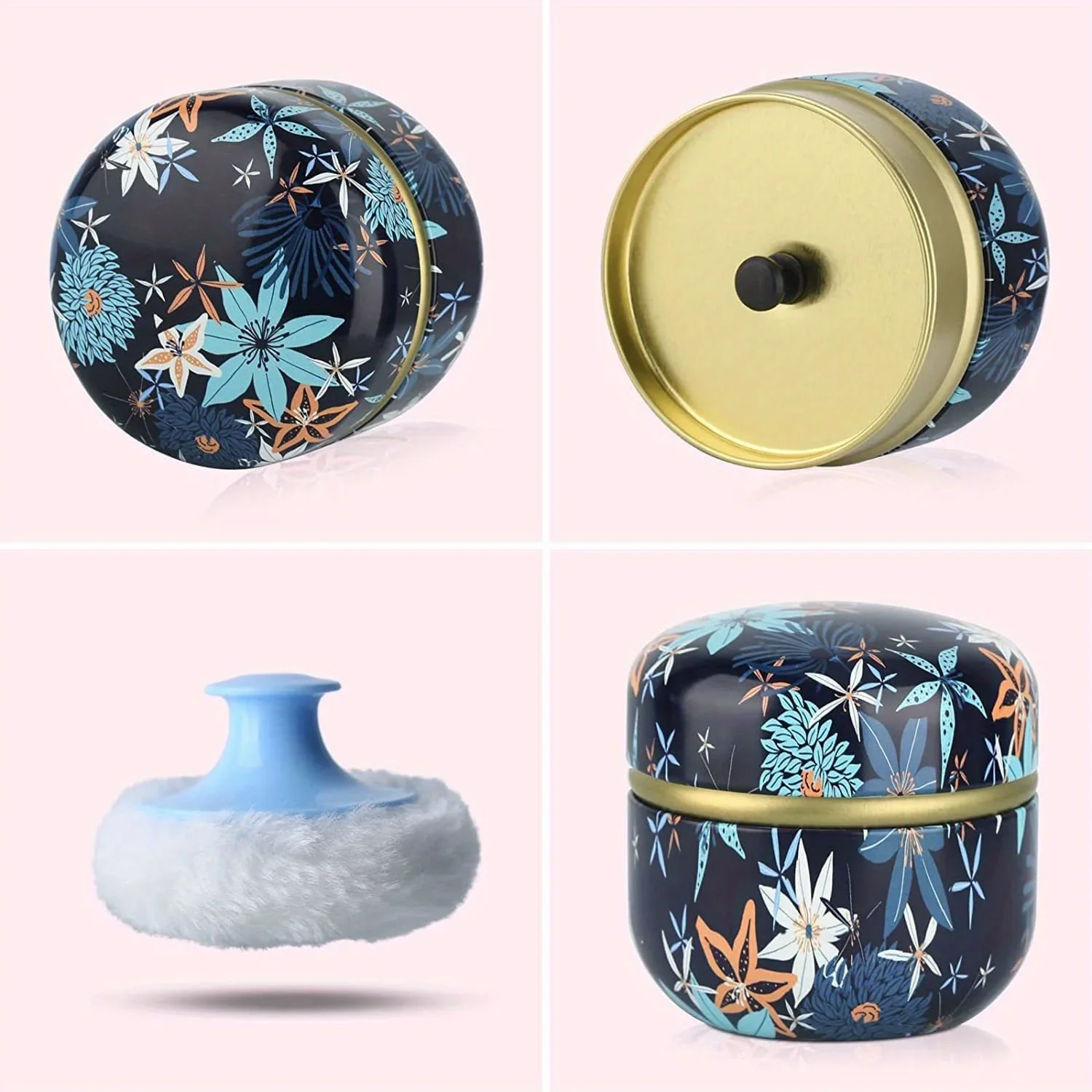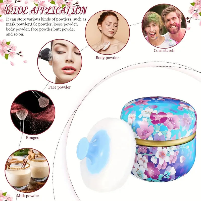 The powder box has a delicate appearance and a variety of patterns for you to choose. The powder box is made of high-quality tinplate, which are not easy to break after being dropped, and not fade easily, and can be used for a long time. There is also a lid inside the powder box, so you don't have to worry about spilling powder.