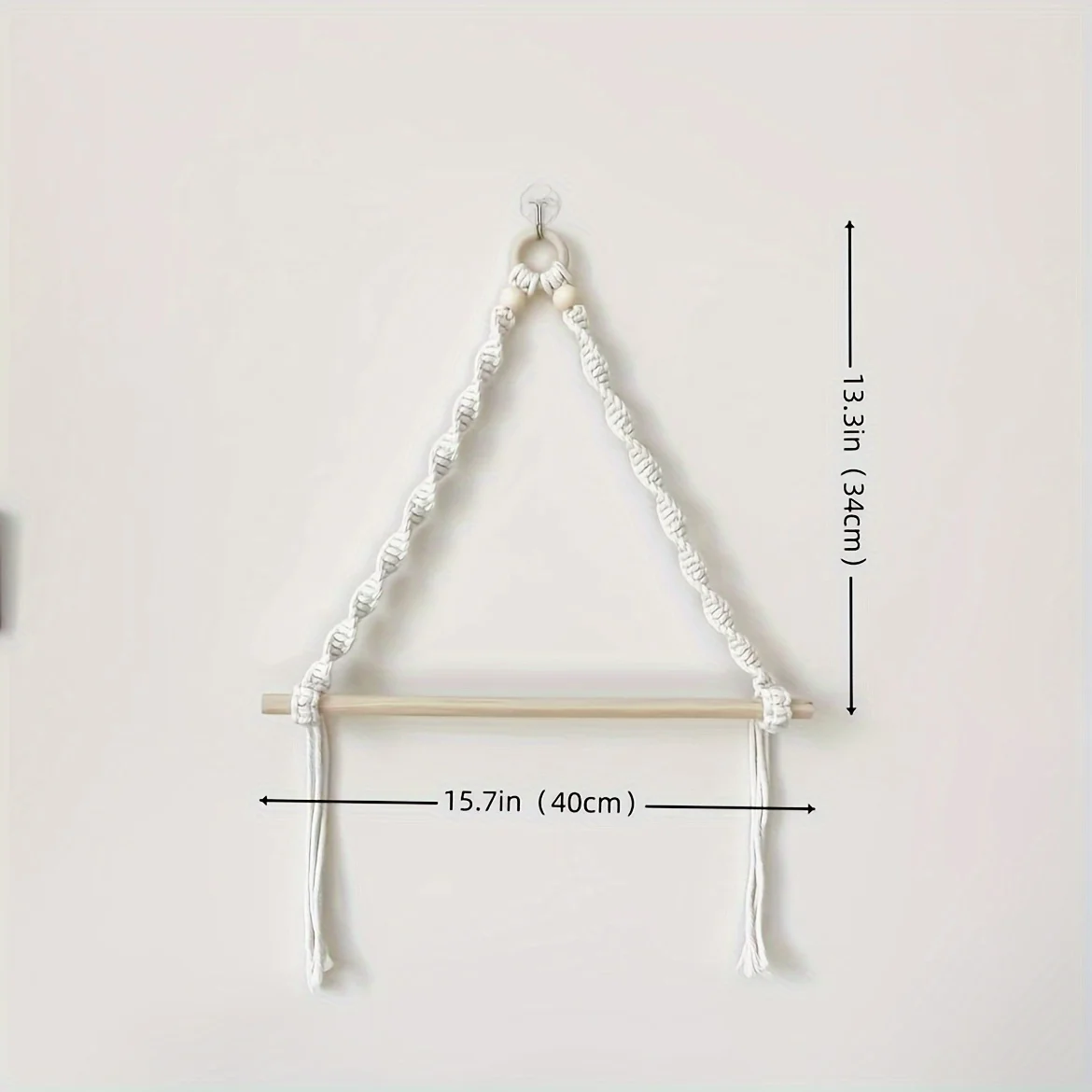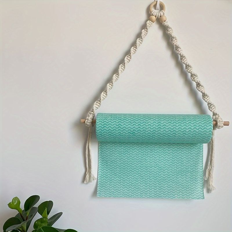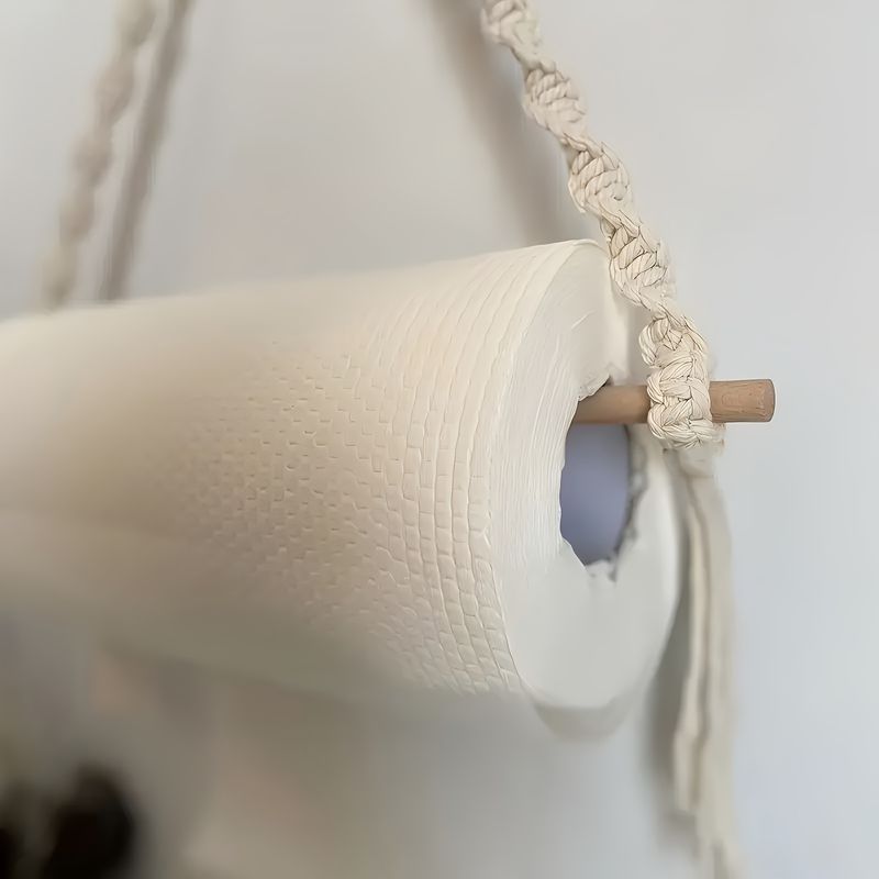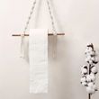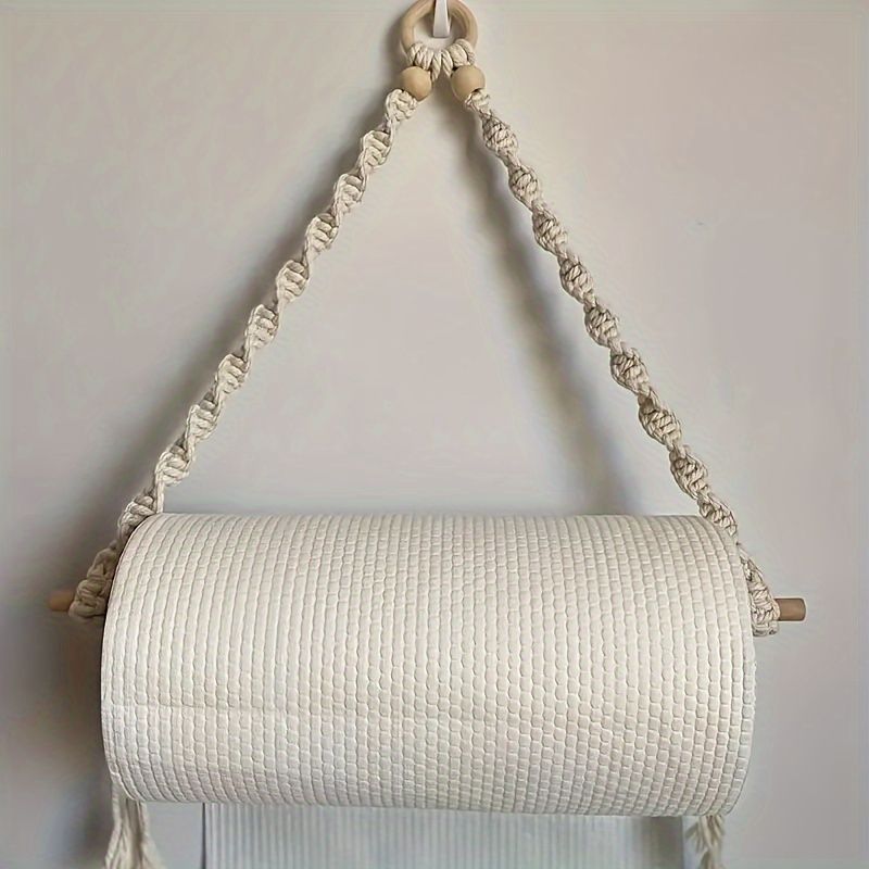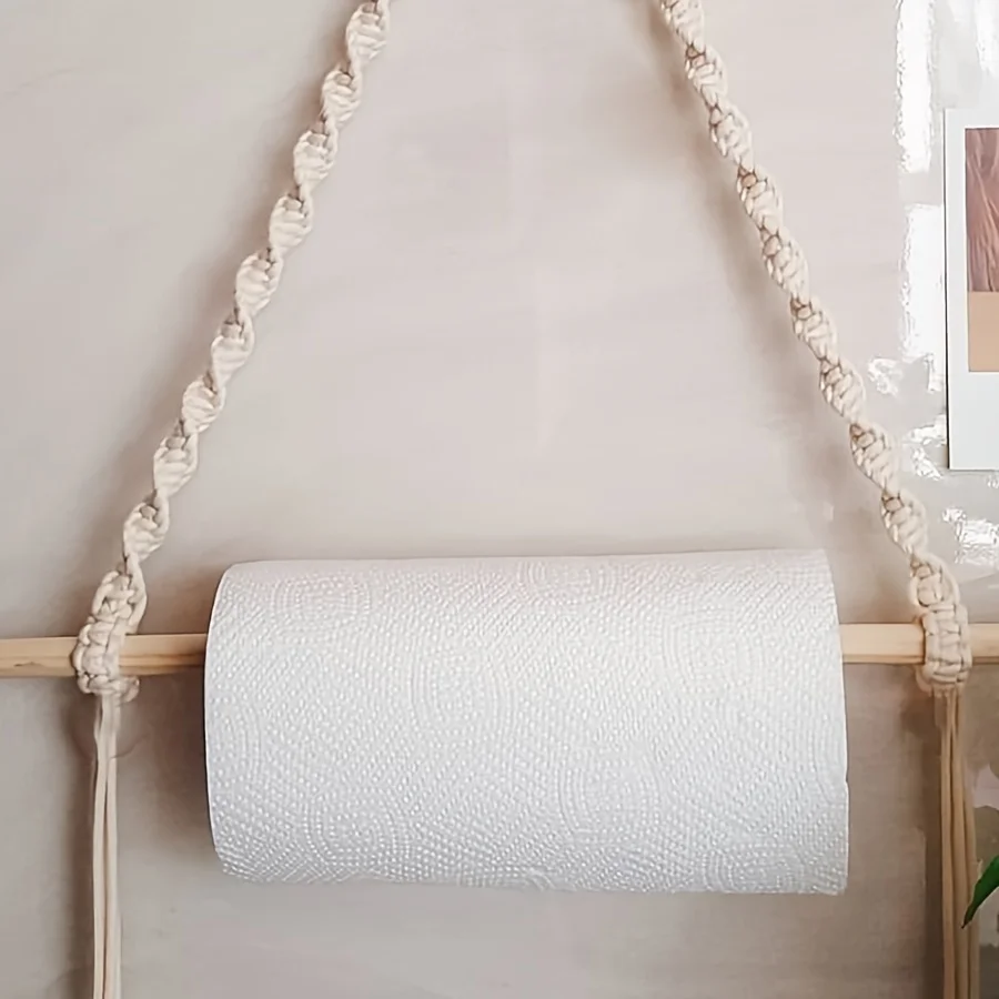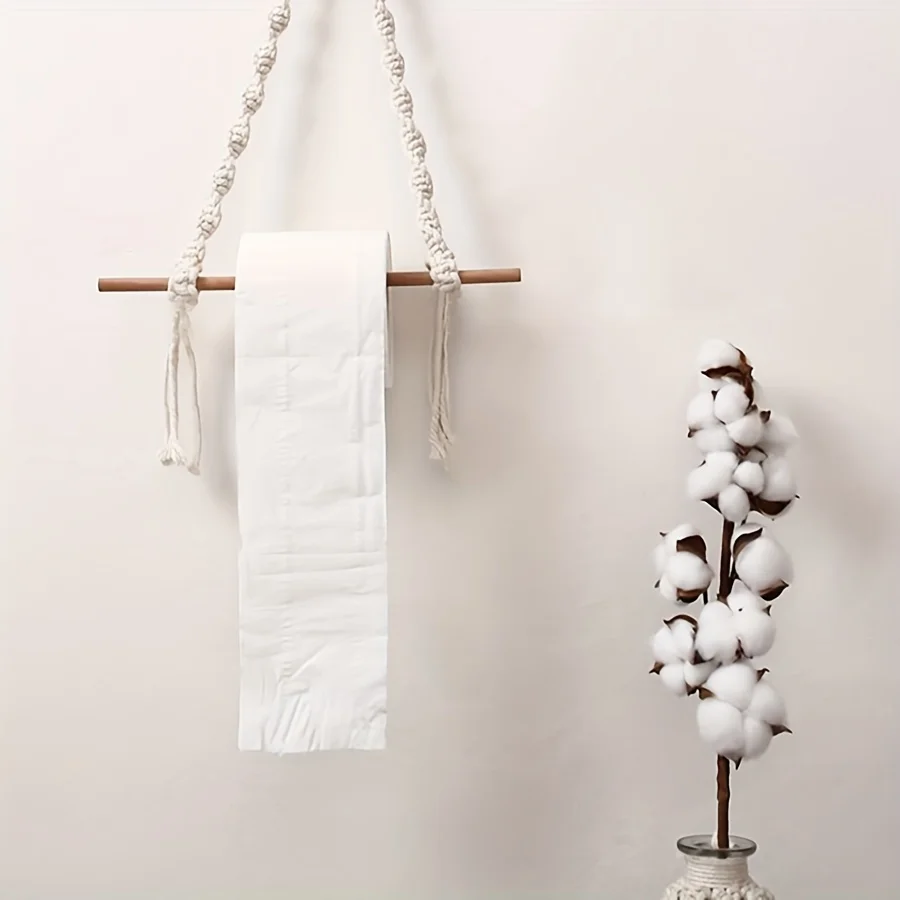 Boho Chic Macrame Toilet Paper Holder with Dowel 40cm Wall-Mounted Self-Adhesive White Woven Fringe for Bathroom Kitchen Bedroom