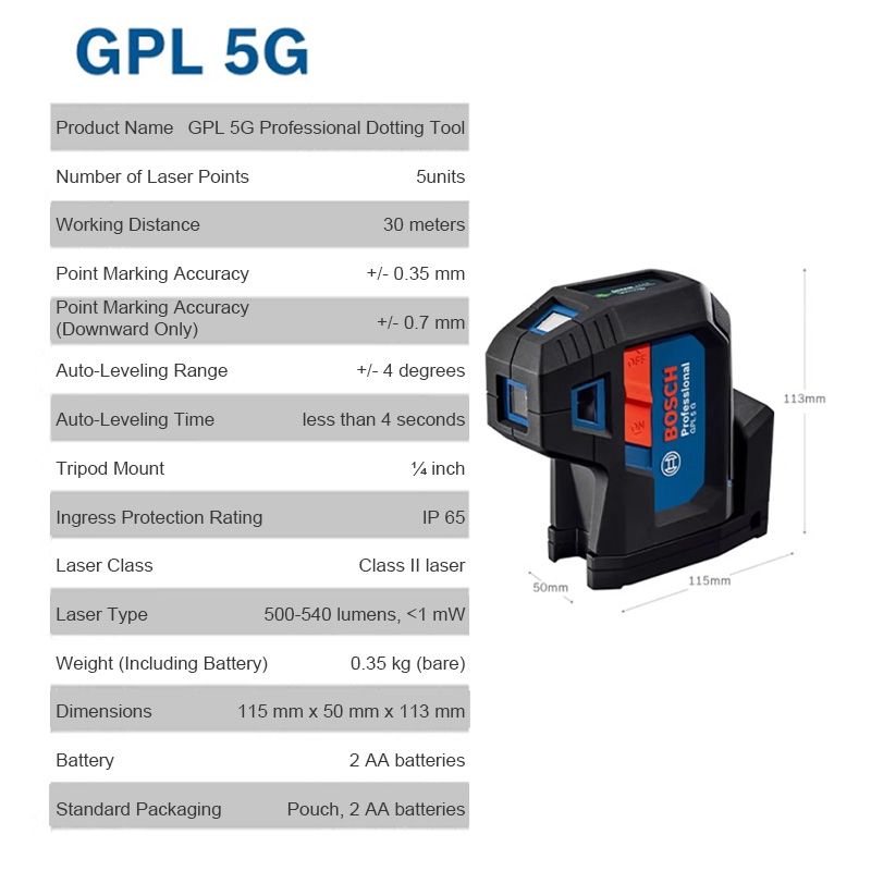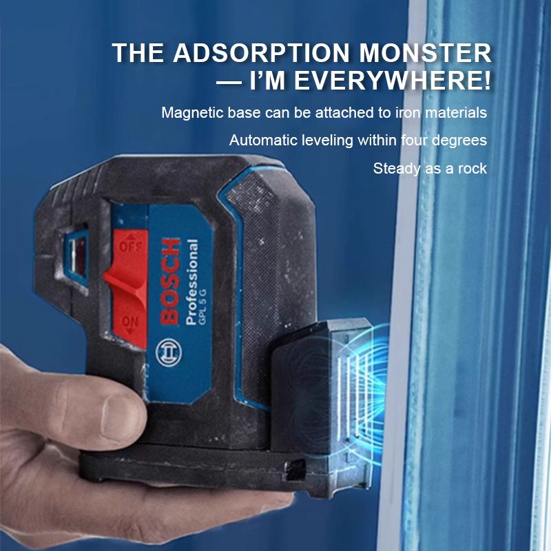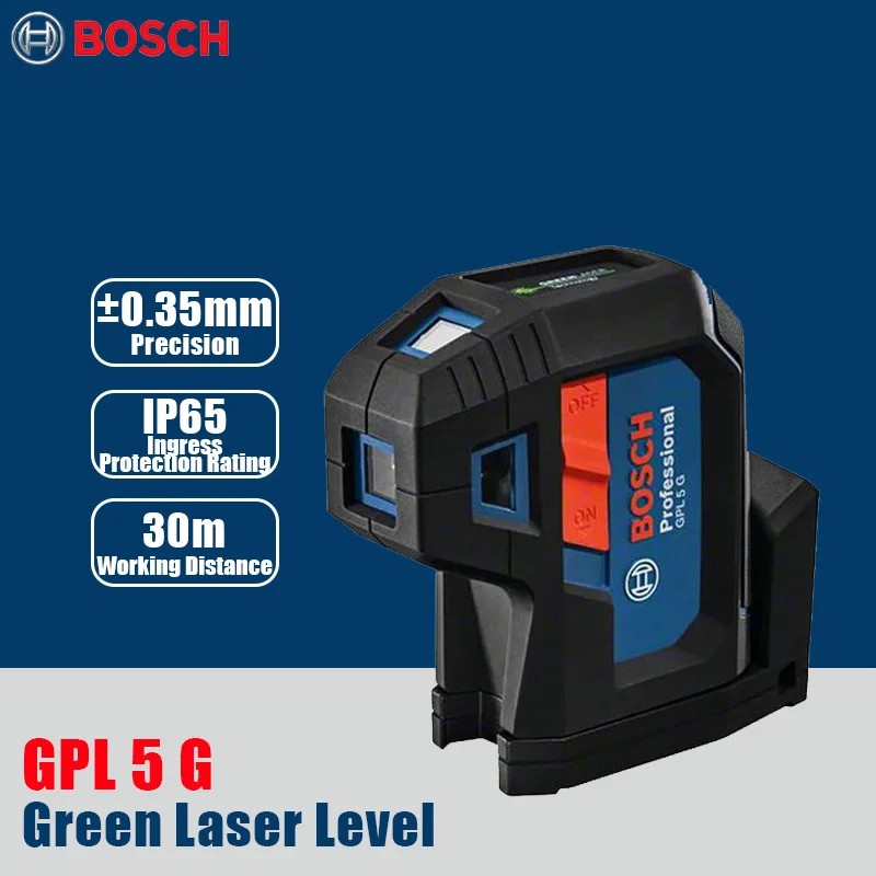The point laser offers high visibility thanks to green laser technology, and provides precise results with an accuracy of ± 0.35 mm/m* (± 0.7 mm/m* for dot down). The GPL 5 G can self-level up to +/- 4 degrees in under 4 seconds.A simplified interface with only an on/off switch makes the point laser easy to use. It also features a robust integrated mount with strong magnets, to provide easy rotating and fastening on magnetizable surfaces.