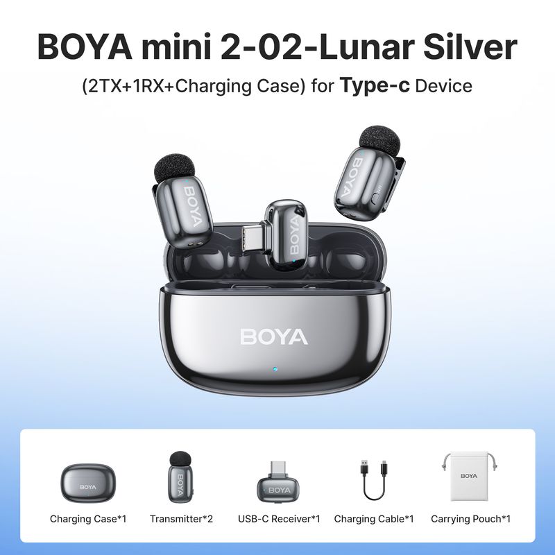 The BOYA mini 2 also adds parameter control via the BOYA Central App,allowing users to adjust gain and apply EQ control for different recordingneeds. Each transmitter provides up to 6 hours of use on a single charge,and the charging case extends total operating time to 30 hours. lt is idealfor content creation, live streaming, vlogging, and mobile journalism.