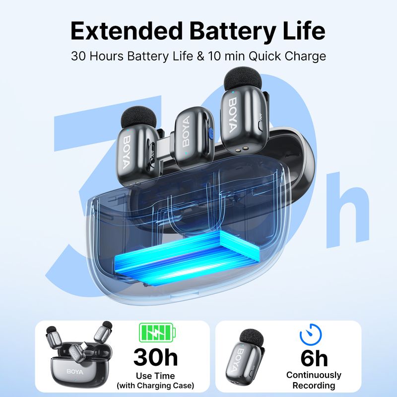 The BOYA mini 2 also adds parameter control via the BOYA Central App,allowing users to adjust gain and apply EQ control for different recordingneeds. Each transmitter provides up to 6 hours of use on a single charge,and the charging case extends total operating time to 30 hours. lt is idealfor content creation, live streaming, vlogging, and mobile journalism.