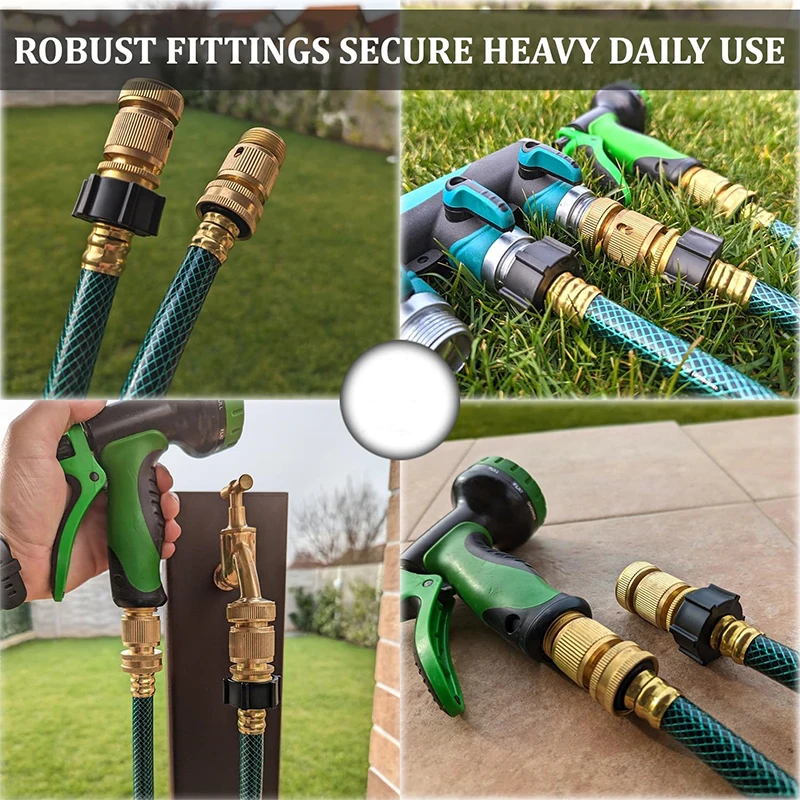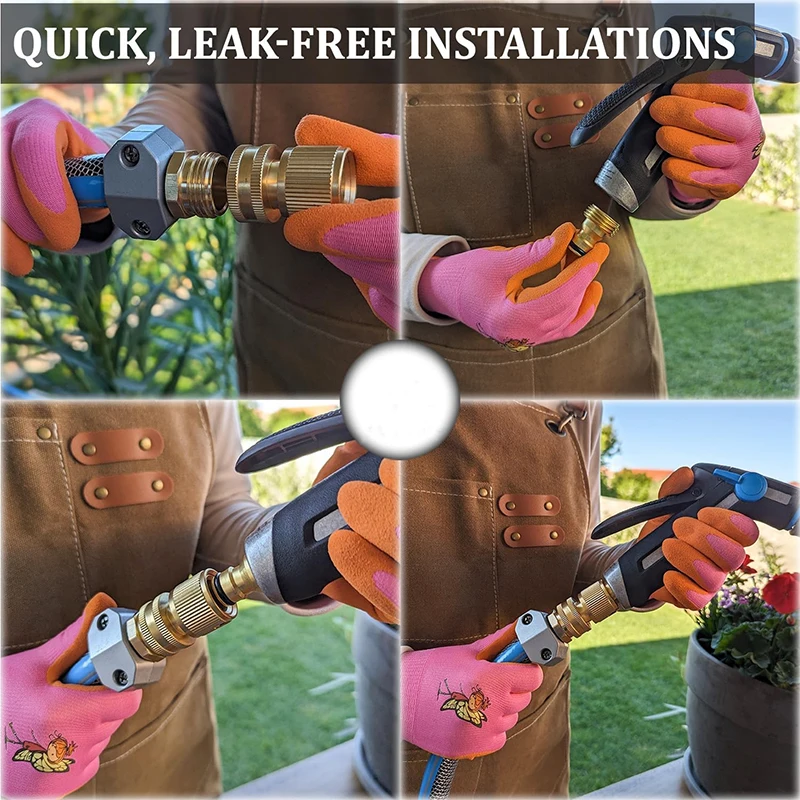 3/4 GHT Universal Fit: Specifically designed to cater to garden enthusiasts, the brass quick connect hose fittings system is universally compatible with all 3/4 inch gardening hoses. This ensures a perfect fit for a variety of garden equipment, including hoses, faucets, sprinklers, nozzles and other water distribution systems.