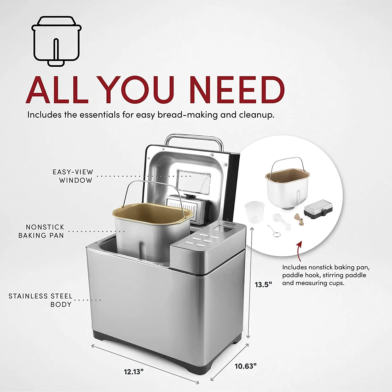 Accessories hook, measuring cup, measuring spoon, kneading paddle, non-stick bread pan