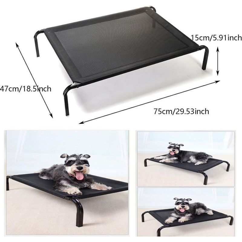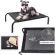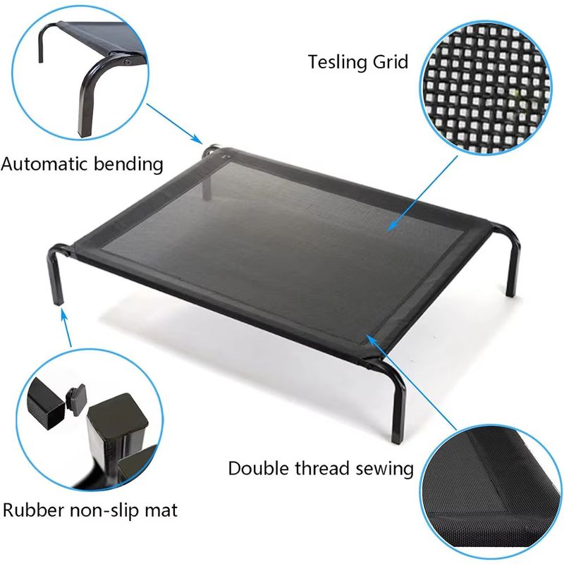 - This elevated folding pet bed is equipped with waterproof and breathable mesh, with black steel frame.