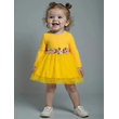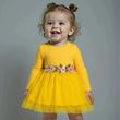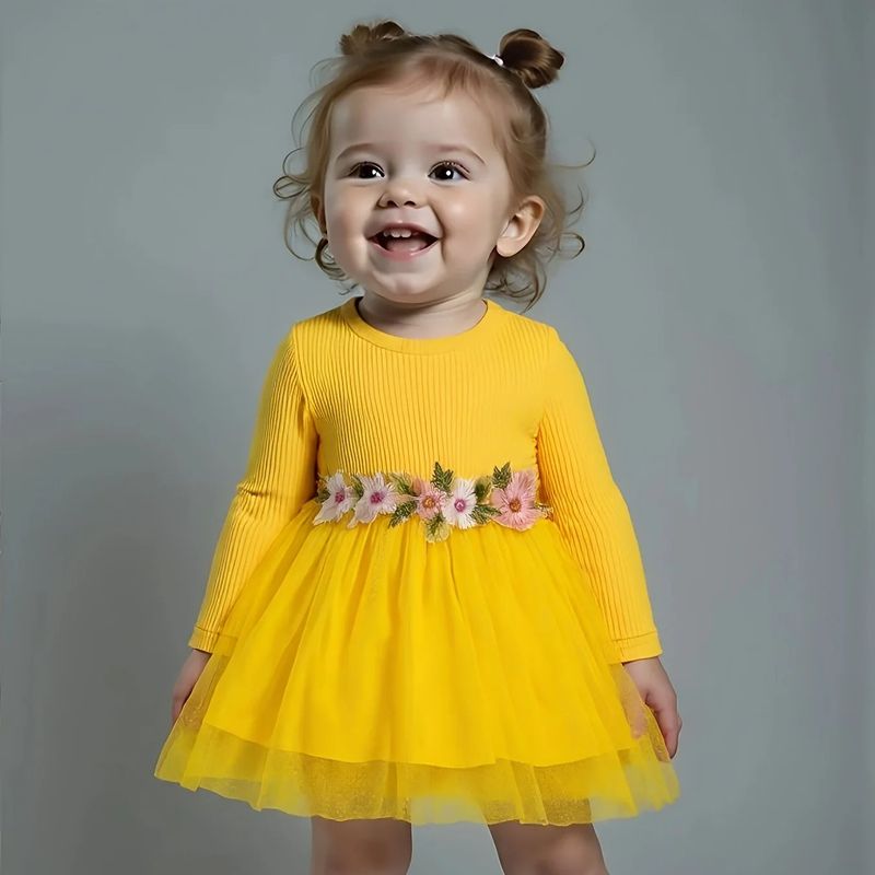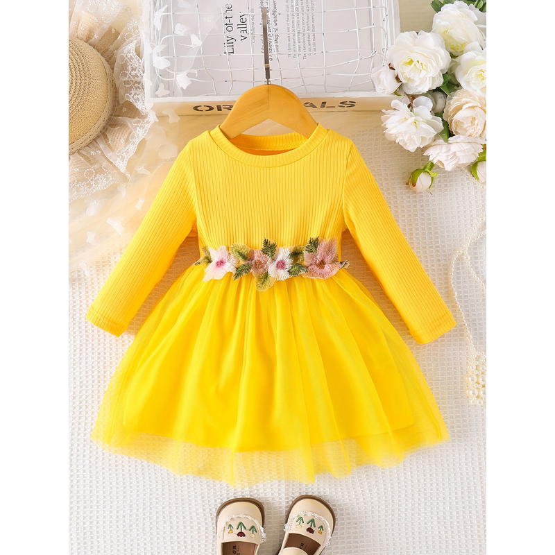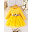 Bright Yellow Knit 3D Flower Dress - Double Tulle Hem Girls’ Vitality Sweet Daily Princess Gown