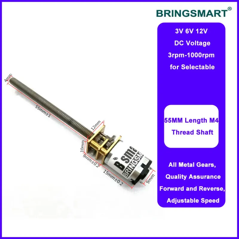 Bringsmart M4 55mm Threaded Shaft DC Gear Motor 3V 6V 12V 15/30/50/60/100/200/300/500/1000rpm Mini Electric Screw Reducer N20