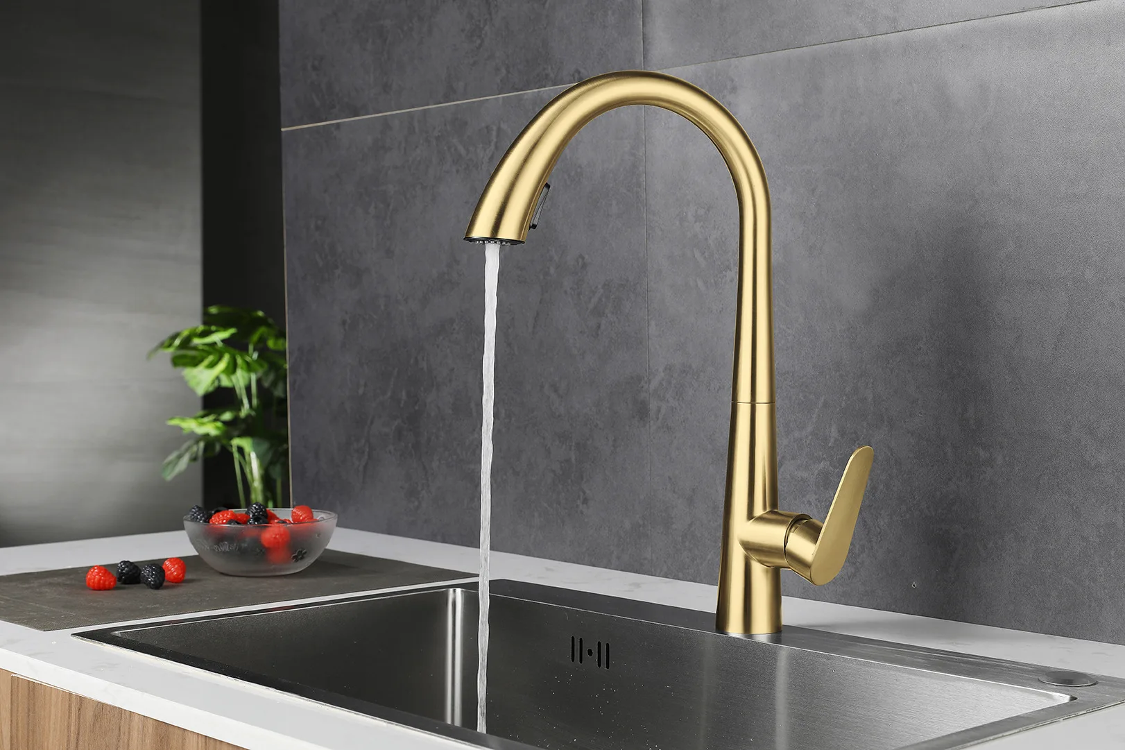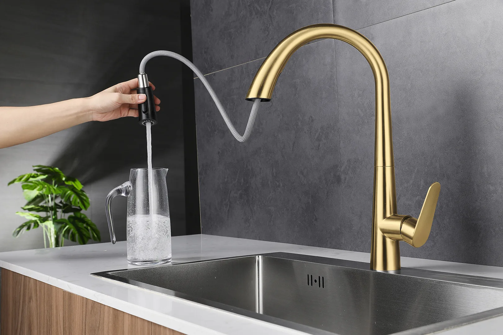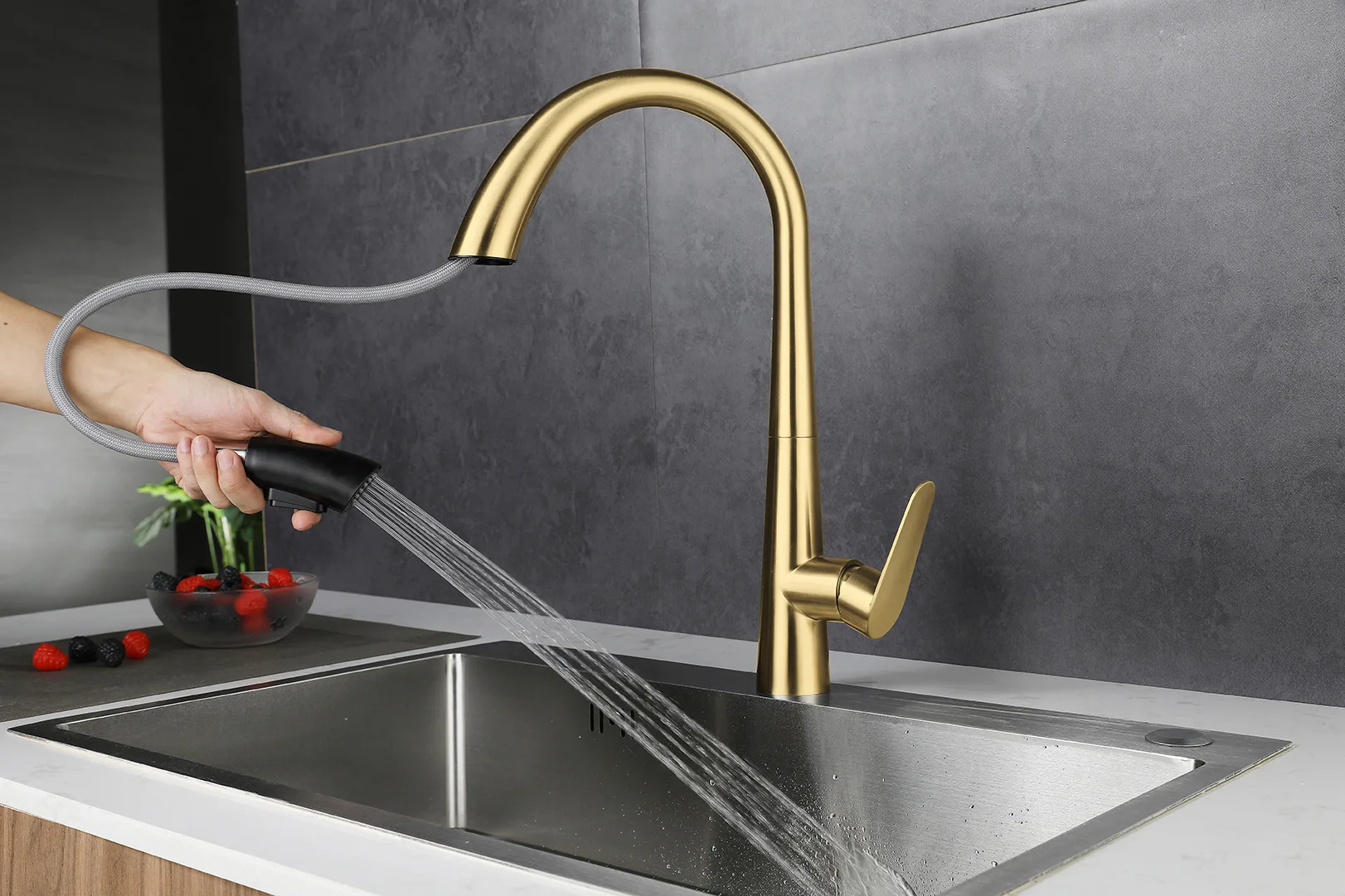 Brushed Gold 304 Stainless Steel Kitchen Pull-Out Tap Sink Vegetable Washing Basin Dishwashing Basin Telescopic Hot and Cold Tap