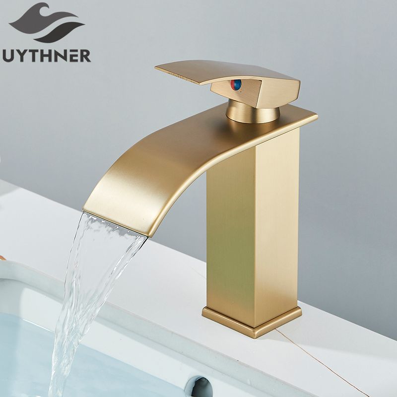 Brushed Golden Basin Faucets Elegant Waterfall Bathroom Sink Faucet Single Lever Hole Deck Mount Brass Mixer Taps