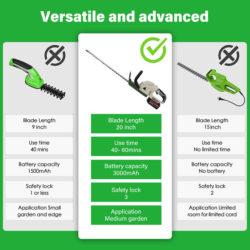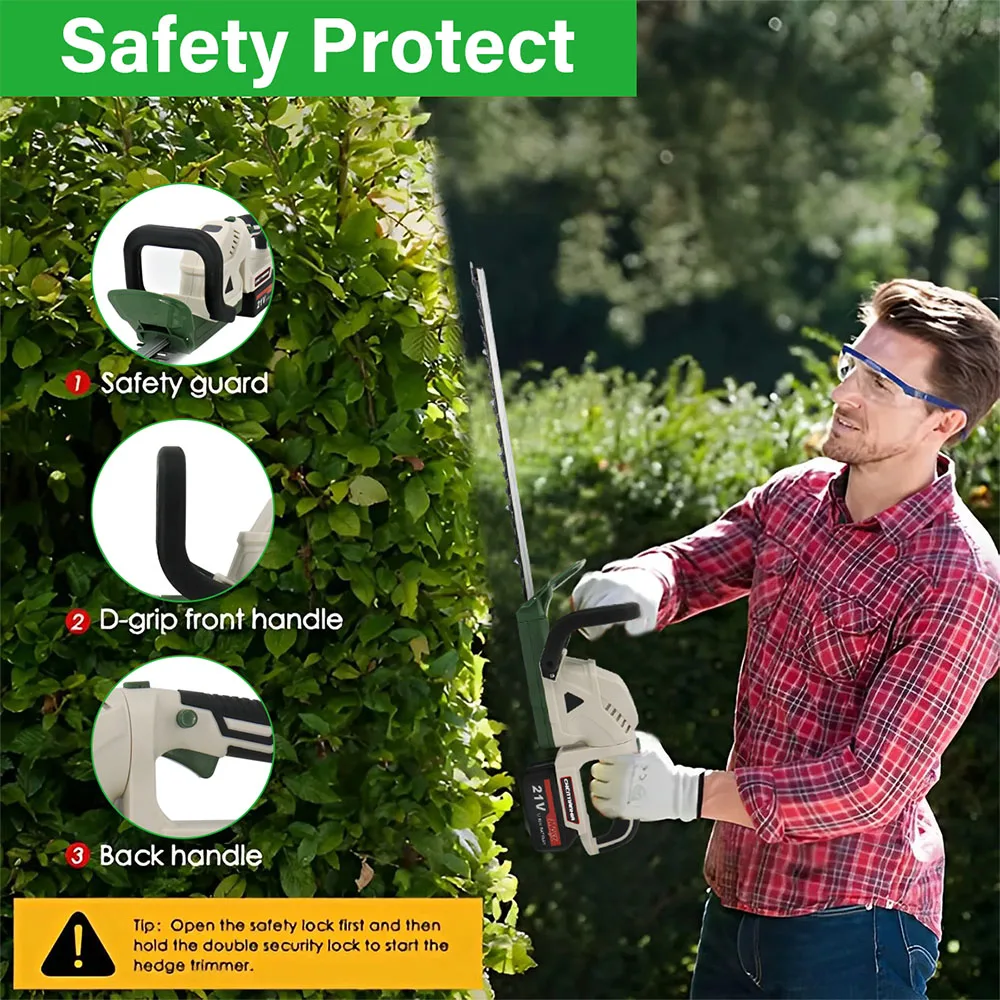 Our electric hedge cutter offers superior safety features such as an immediate shut-off when the trigger is released, helping to prevent potential injury if dropped. Enjoy a secure and reliable trimming experience.