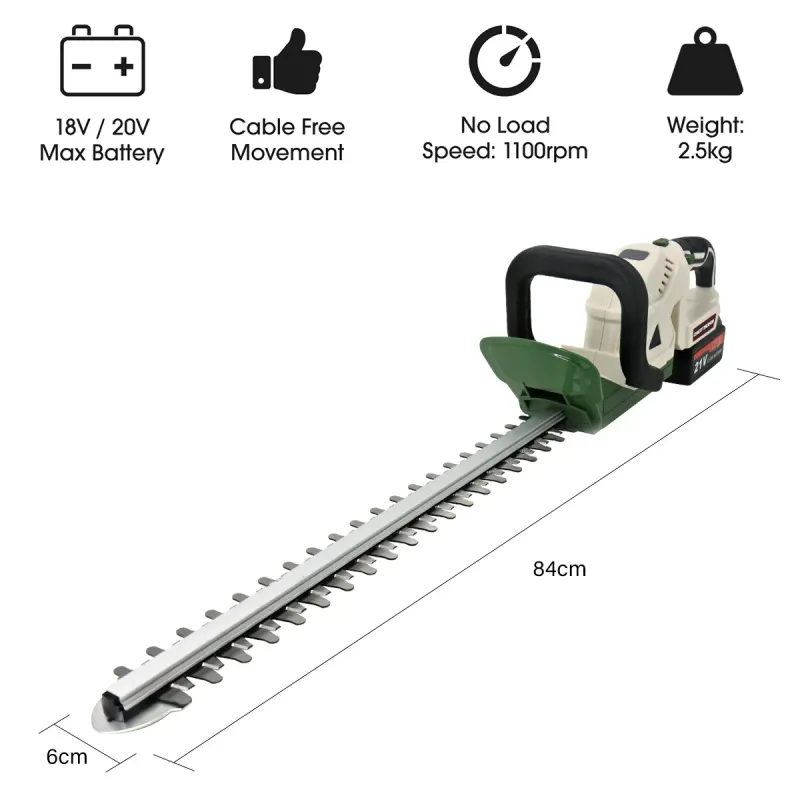 This powerful cordless hedge trimmer is powered by a 21V Max 1500mAh motor, offering superior power and performance. The 51cm long length cutting blade enables effortless cutting of twigs and branches up to 15mm thick, giving you complete control of your hedges.
