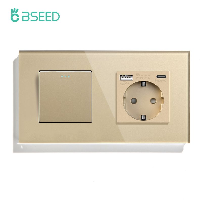 BSEED 1/2/3Gang Mechanical Wall Light Switch 1Way With Power Sockets USB Type-c Charging Ports EU Standard Glass Panel Gold