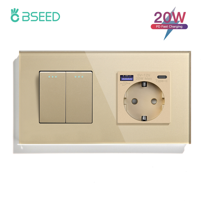 BSEED 1/2/3Gang Mechanical Wall Light Switch 1Way With Power Sockets USB Type-c Charging Ports EU Standard Glass Panel Gold