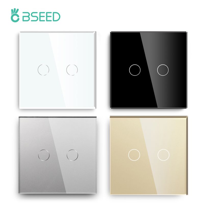 Bseed 2 Gang 1 Way Touch Switch 300W EU Standard Home Light Switch Black White Golden With Crystal Glass Panel