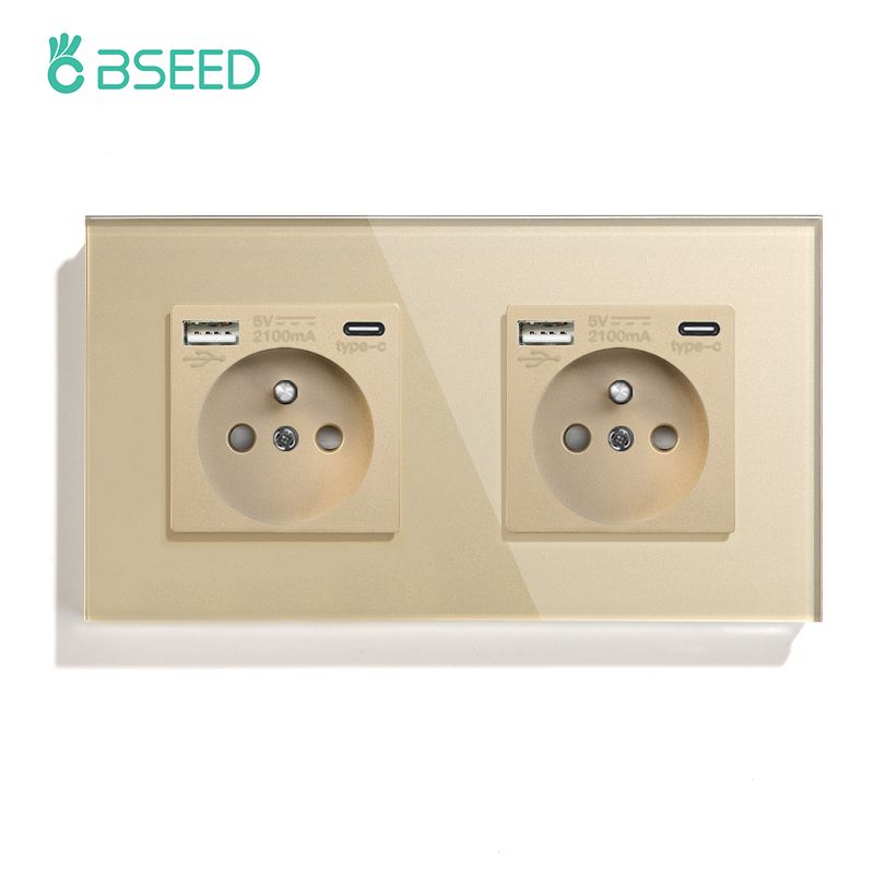 BSEED France Standard Single Wall French Socket Double Power Plug With White Black Gloden Crystal Glass Panel 16A 110V-250V