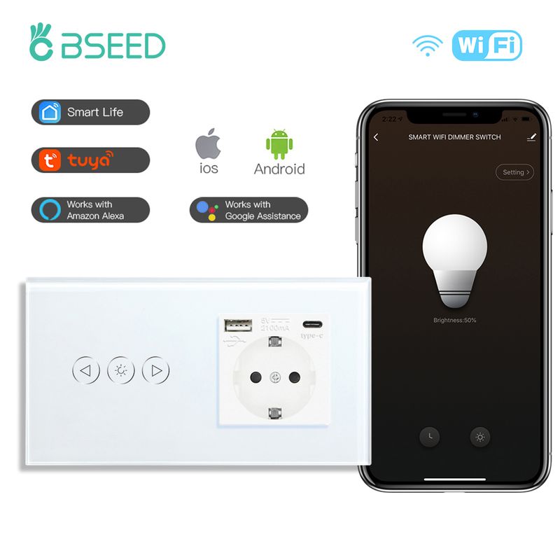 BSEED Wifi Dimmer Switches 1Gang Smart Touch Switch Up Down Tuya Smart Life Alexa App With EU Wall Socket Type-c USB Ports