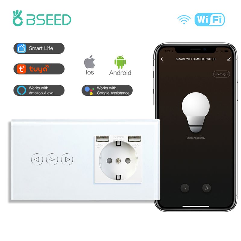 BSEED Wifi Dimmer Switches 1Gang Smart Touch Switch Up Down Tuya Smart Life Alexa App With EU Wall Socket Type-c USB Ports