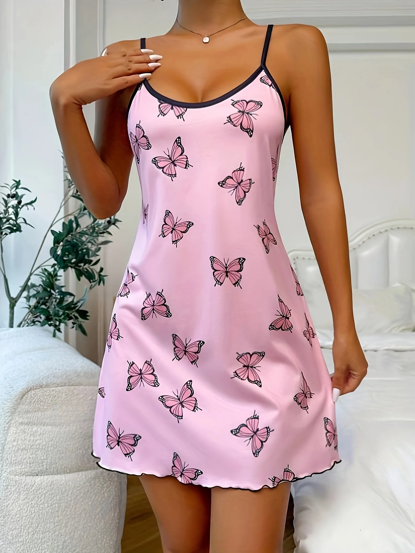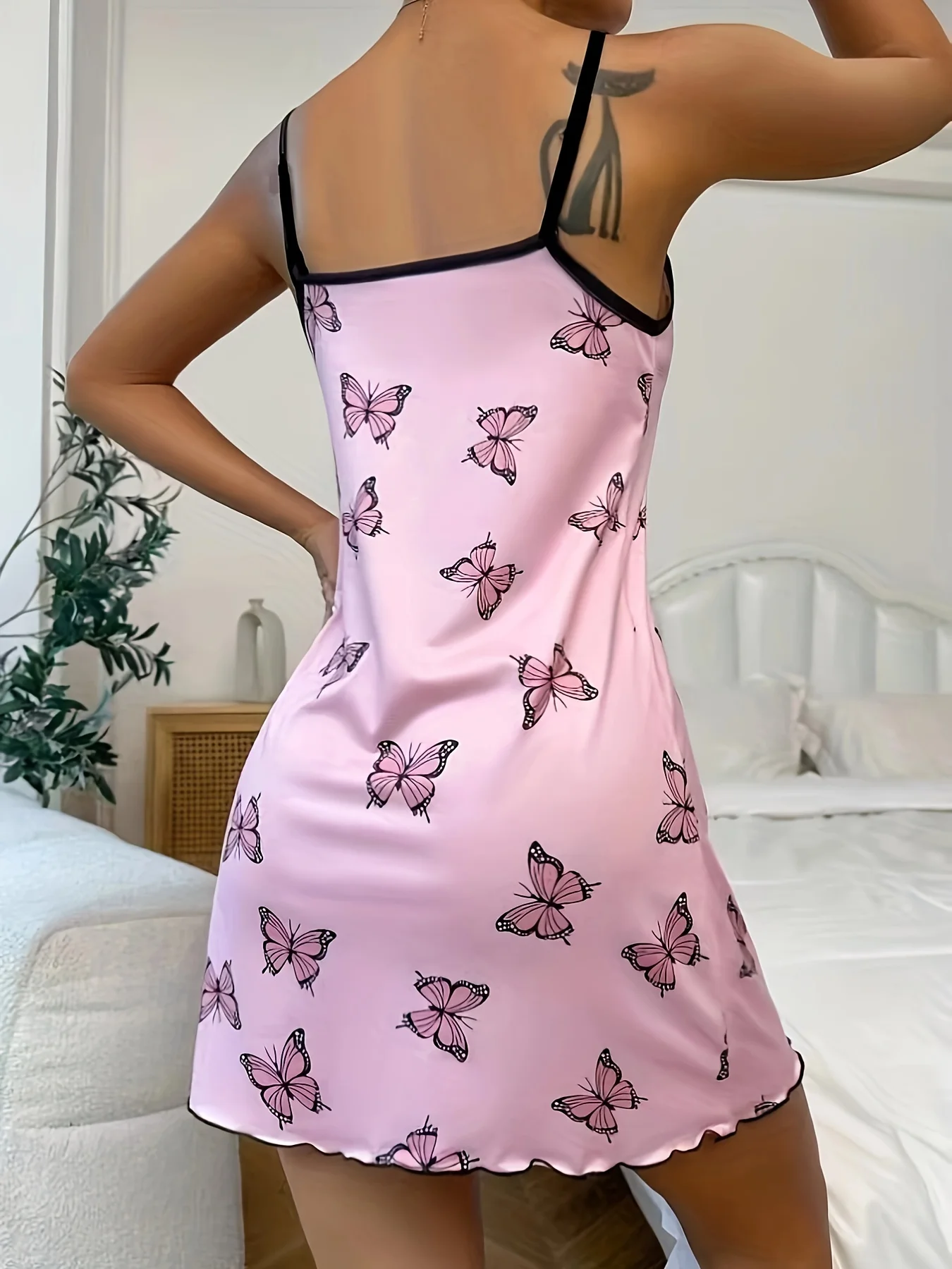 Butterfly Print Sexy Nightgown for Women Spaghetti Strap Sleep Dress Silky Homewear Summer Loungewear Nightwear Slip