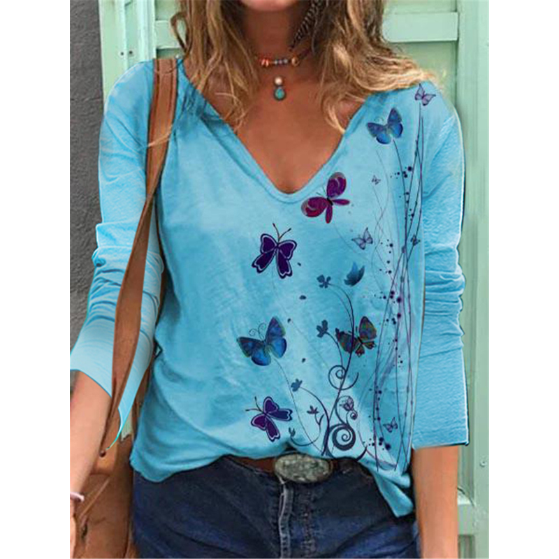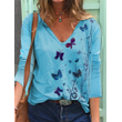 Butterfly Printed Long Sleeve V-neck T-shirt For Women Blue 2XL