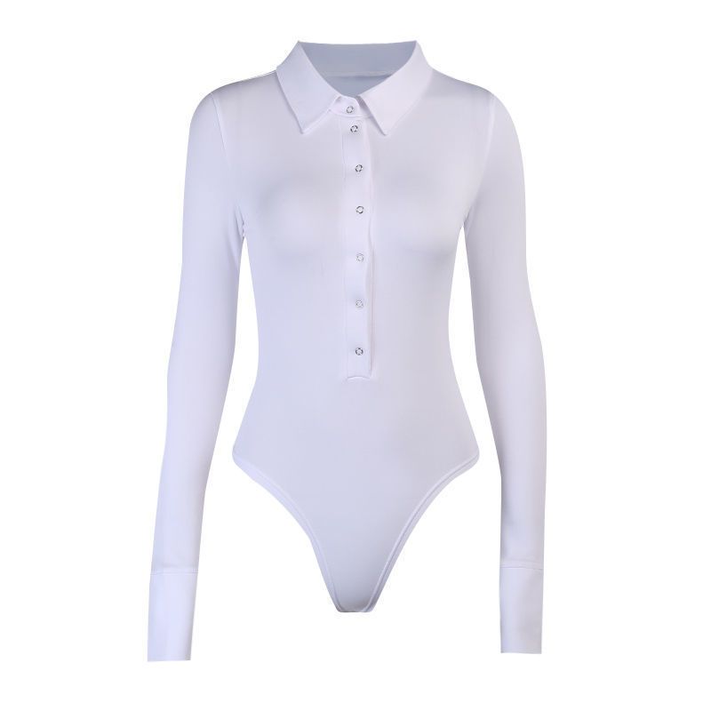 Button POLO Collar Long Sleeve Jumpsuit Sexy Slim Bottoming Shirt Brown S