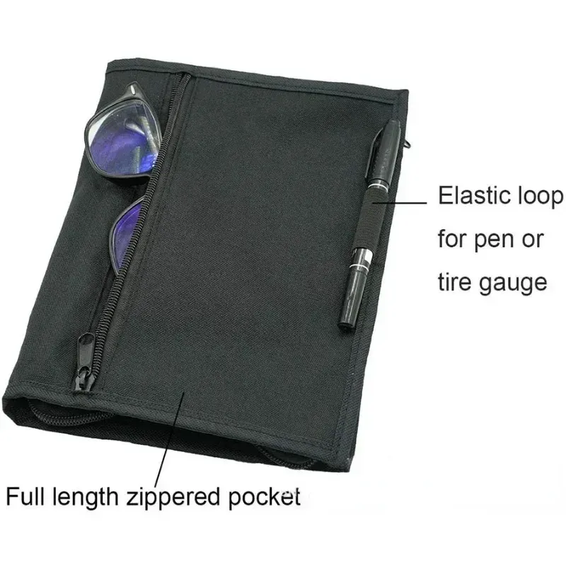 3.Zippered outside pocket for quick access items, elastic loop for pen or tire gauge.