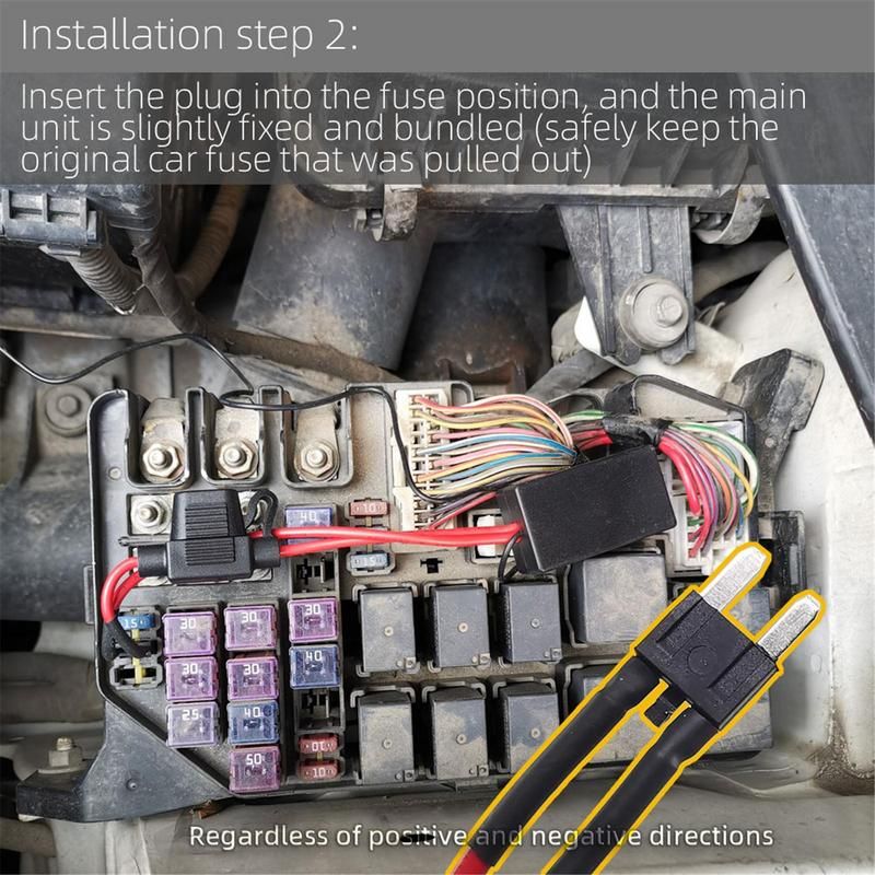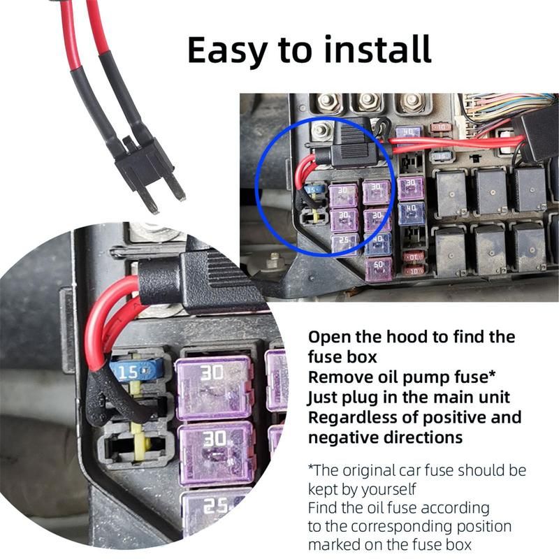First, open the fuse box, find the oil pump fuse and pull it out, then replace it with the red wire plug, Keep the original fuse in a safe place, fix the main unit with a tie and cover the fuse box.