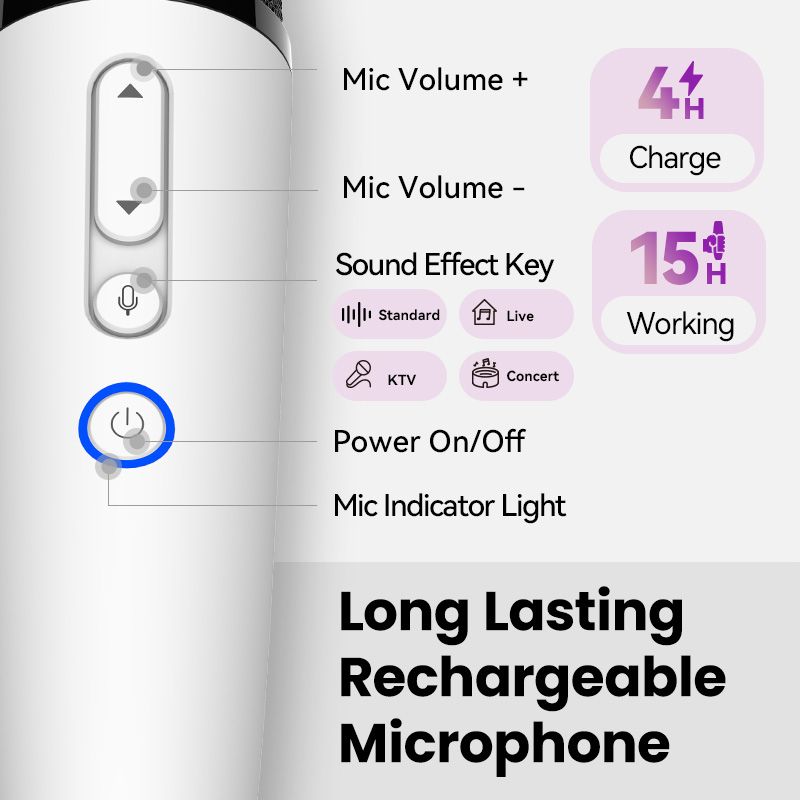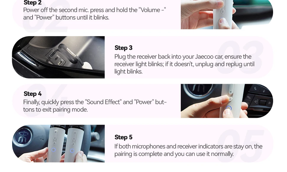 Press the microphone in Step 1, and press the "Voice Key" and "Power Key" at the same time to exit the pairing mode; The same method as above for the microphone in Step 2.