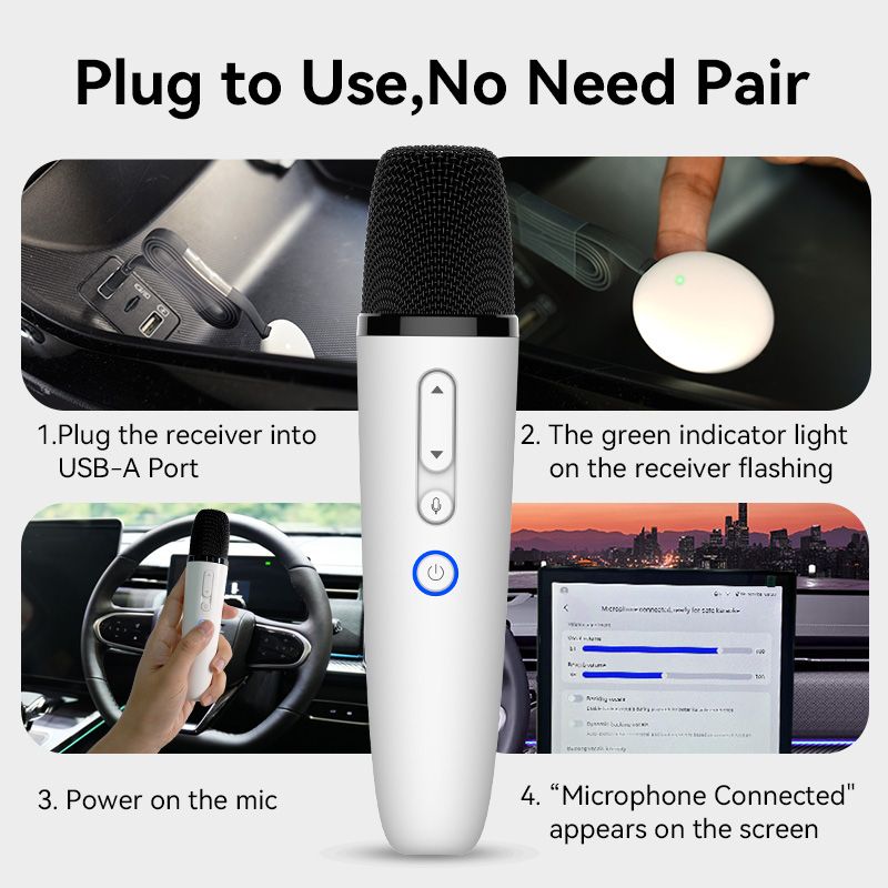 Answer4: Once the microphone receiver is inserted into your vehicle, all music and karaoke apps pre-installed on your car’s will work perfect. Additionally, music apps can also function as karaoke tools through the Karaoke Mixer: our product features a "Vocal Elimination" function, allowing you to adjust the backing vocal level. This transforms regular music apps into karaoke apps effortlessly.Alternatively, you can connect your phone to the car via Bluetooth and use your phone’s karaoke apps with the microphone.