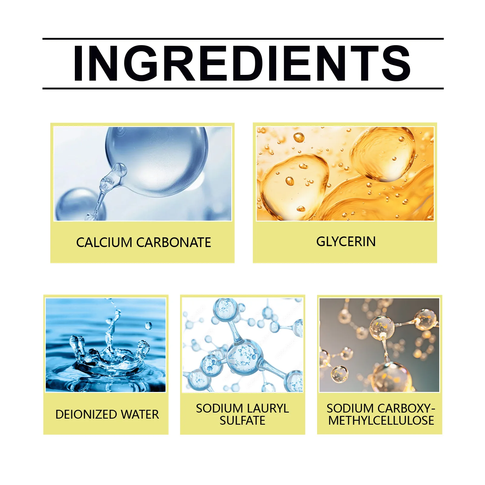 INGREDIENTS:CALCIUM CARBONATE、DEIONIZED WATER、GLYCERIN、 SODIUM LAURYL SULFATE、 SODIUM CARBOXYMETHYL CELLULOSE