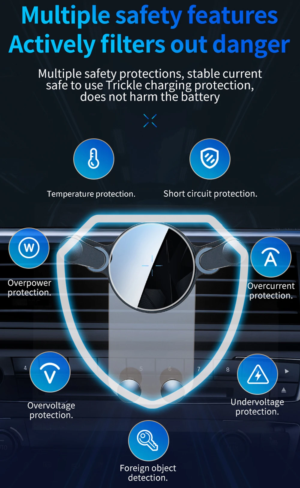 【Intelligent Identification & Intelligent Charging】Enjoy a relaxed and safe driving experience with our car phone holder. It can be operated with one hand, and the bracket will automatically rebound to clamp your mobile phone, providing convenience and enhancing security. In addition, when the mobile phone is fully charged, the bracket will intelligently reduce the charging current to protect the mobile phone battery.