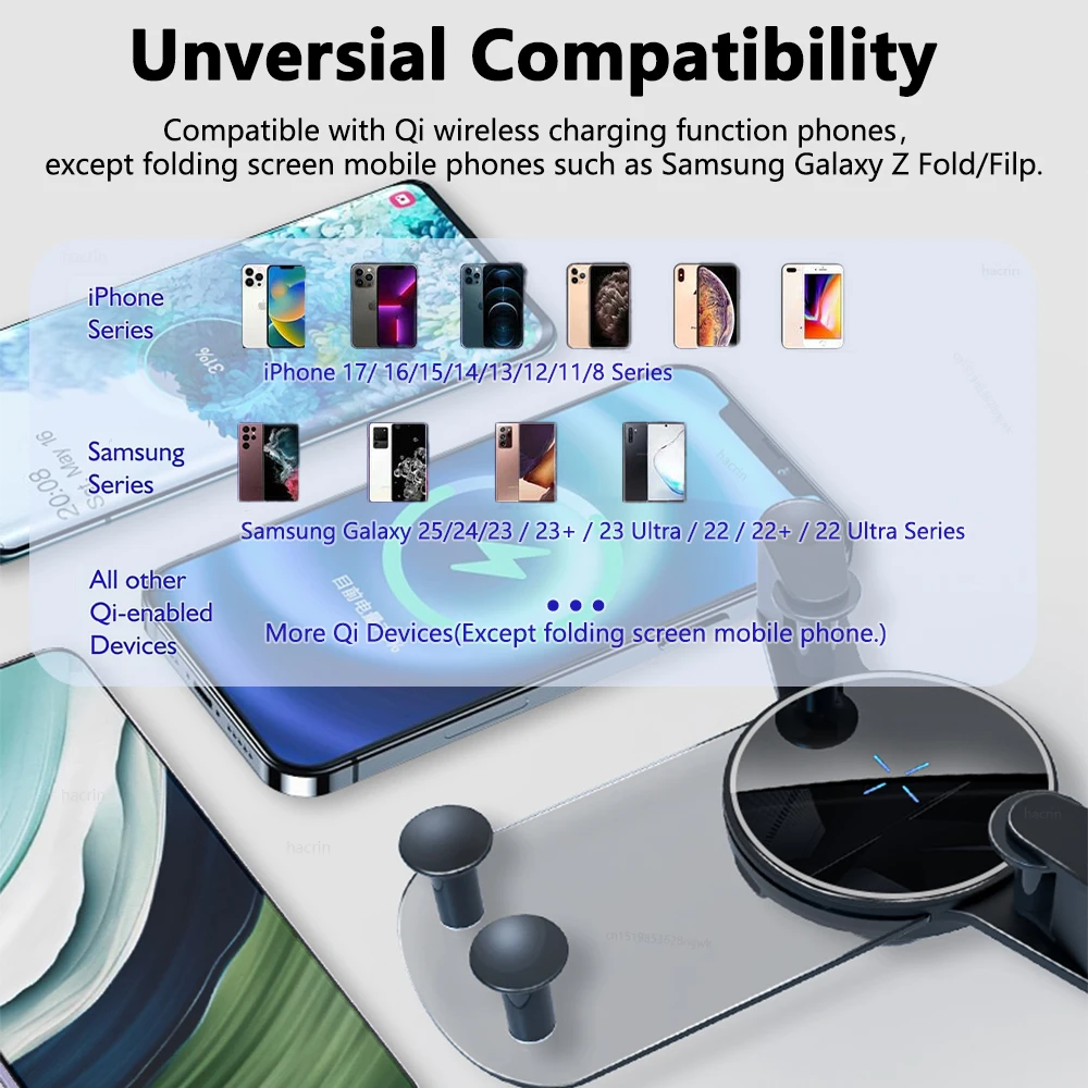 【15W Qi fast wireless charger】The fast charging chip ensures that your Qi device can be charged intelligently and safely at the fastest speed. The charger supports all mobile phones with wireless charging function such as for iPhone 17/16/15/14/13/12/11/8 Series, Samsung Galaxy 25/24/23+/23 Ultra/22+/22 Ultra, and does not support folding screen mobile phones such as Samsung Galaxy Z Fold/Filp.