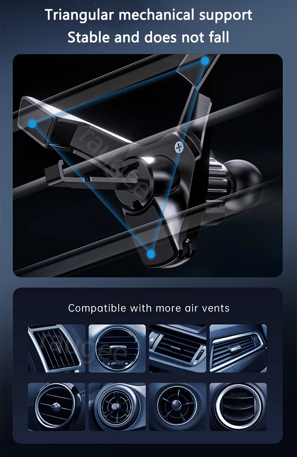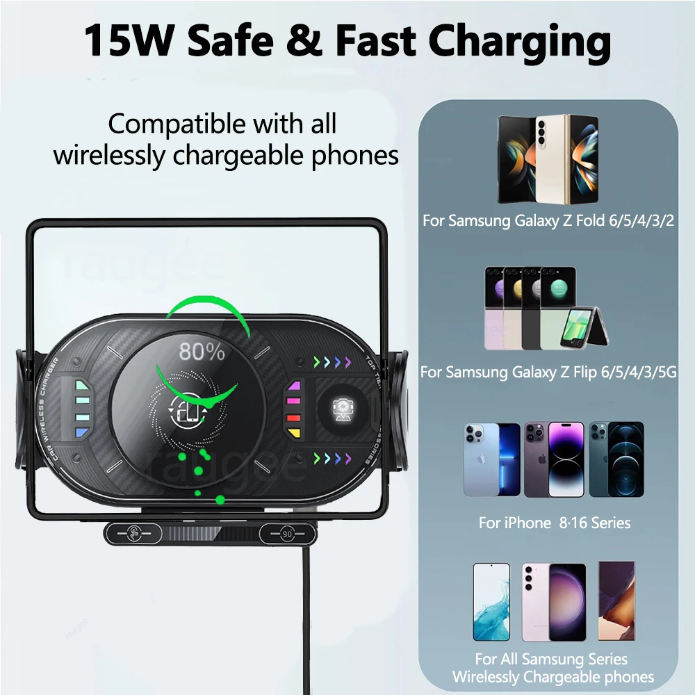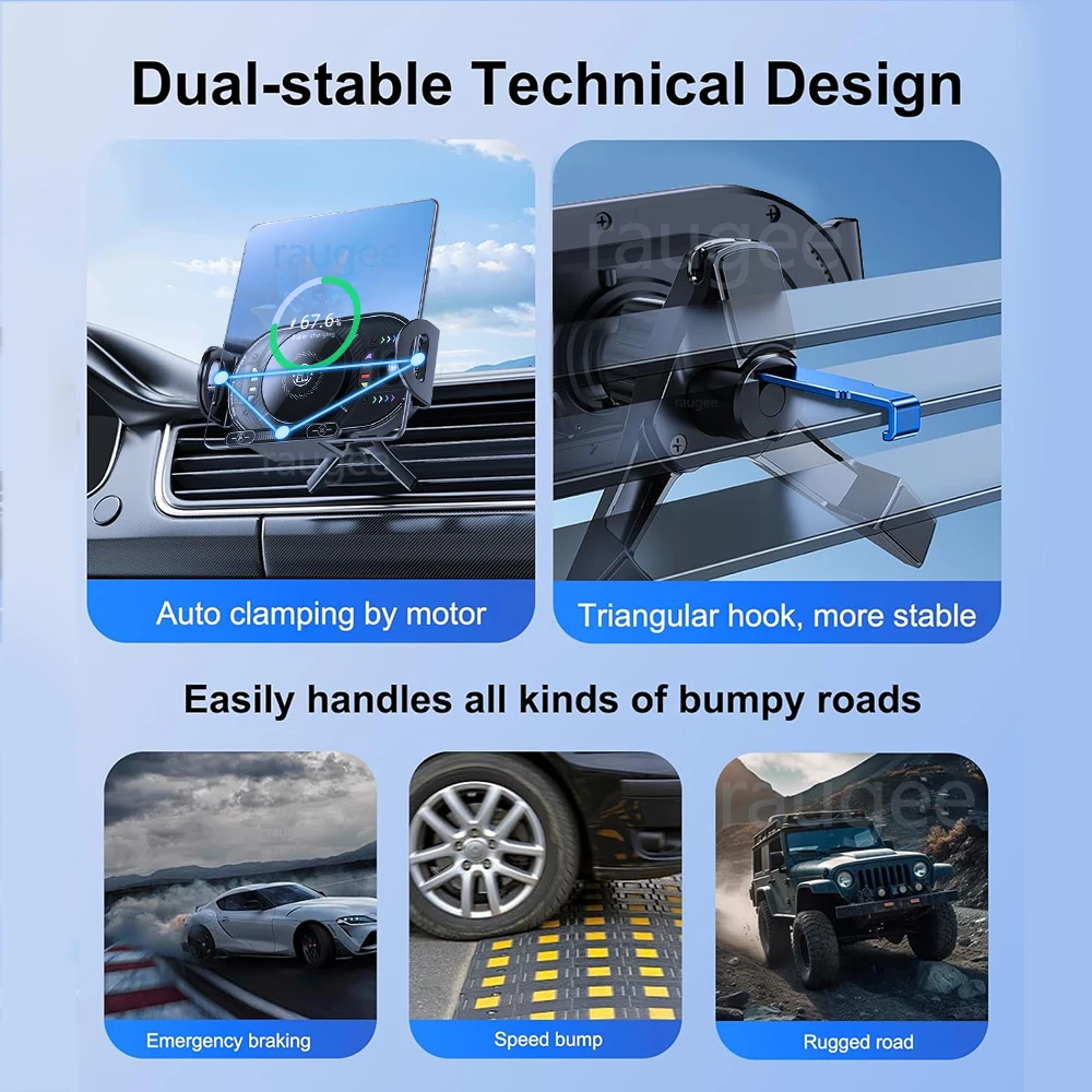 15W Fast Wireless Charging : This raugee car wireless charger has a maximum output power of 15W,and has higher charging efficiency.Which has ensures your device powers up quickly and efficiently on the go.
