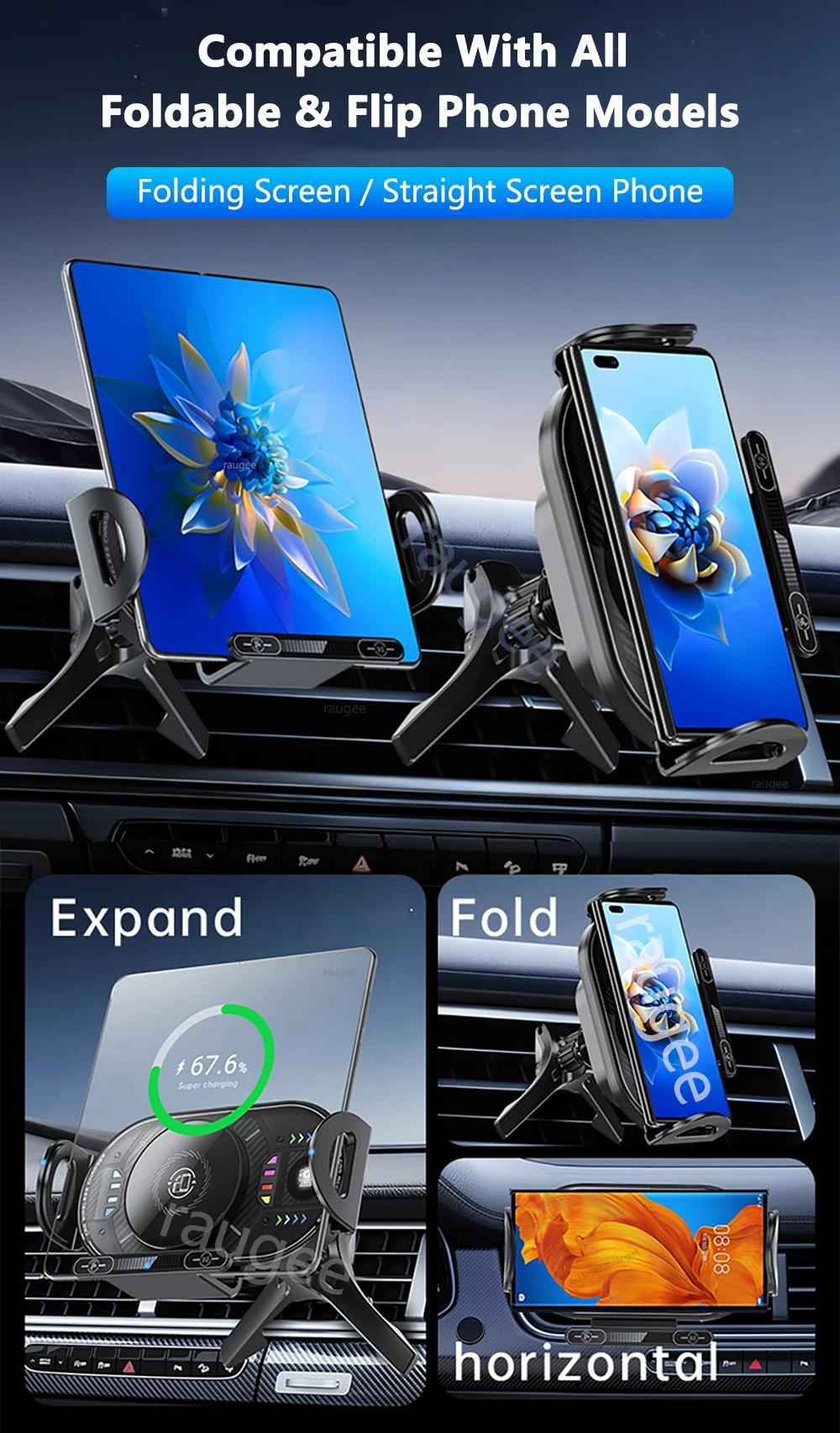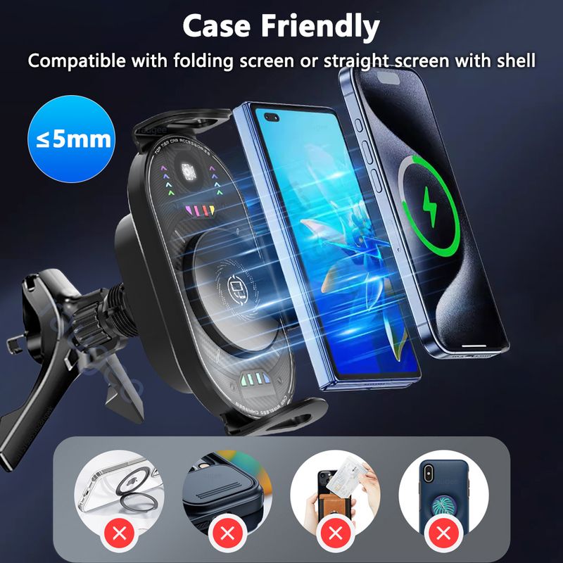 Multi-purpose Design:Cell Phone Car Mount is not only a wireless car charger, but also a high intelligent mobile phone holder. Compatible with a wide range of wireless charging phones, such as: for Samsung Galaxy Z Fold and Z Flip series , for iPhone Huawei and other wireless charging phones. Supports more car vents and the triangular force structure ensures stability.
