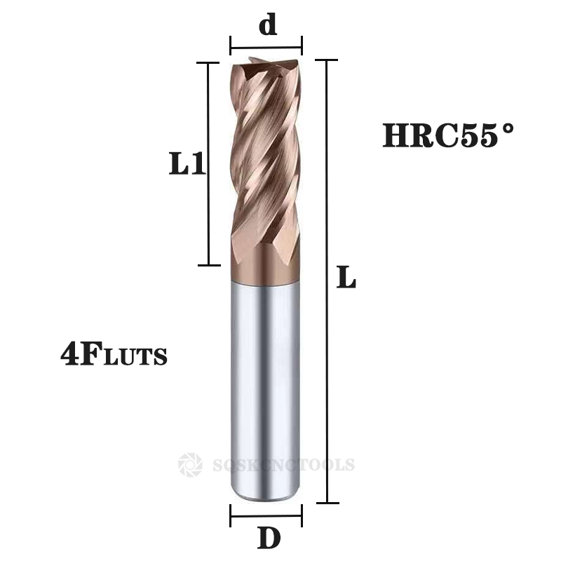 Suitable for milling general steel under HRC 45, stainless steel, hardened steel, etc65° 4 Flutes Carbide End Mills