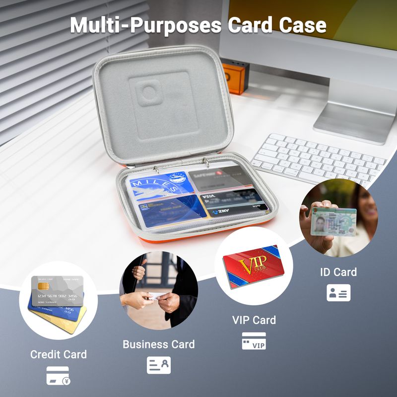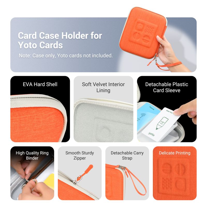 The PROfezzion YT-88 Card Case is specifically designed for Yoto cards. It features 11 double-sided protective pages, each side holding up to 4 cards, for a total capacity of 88 cards, accommodating various storage needs. The transparent pages allow for quick card identification, making it easy to organize and sort. The angled pockets let children easily insert and remove cards. Made with premium EVA material, the outer shell is durable and resistant to external impact and pressure, ensuring card safety. A zipper closure and D-ring handle provide convenient portability. Measuring 206 x 170 x 40 mm, it fits easily into a child's backpack, allowing them to enjoy card content anytime, anywhere. Available in bright orange and blue, this case is vibrant and makes an ideal gift. Additionally, this case is suitable for holding business cards, credit cards, gift cards, and more, catering to various card storage needs and offering a convenient and organized storage experience.